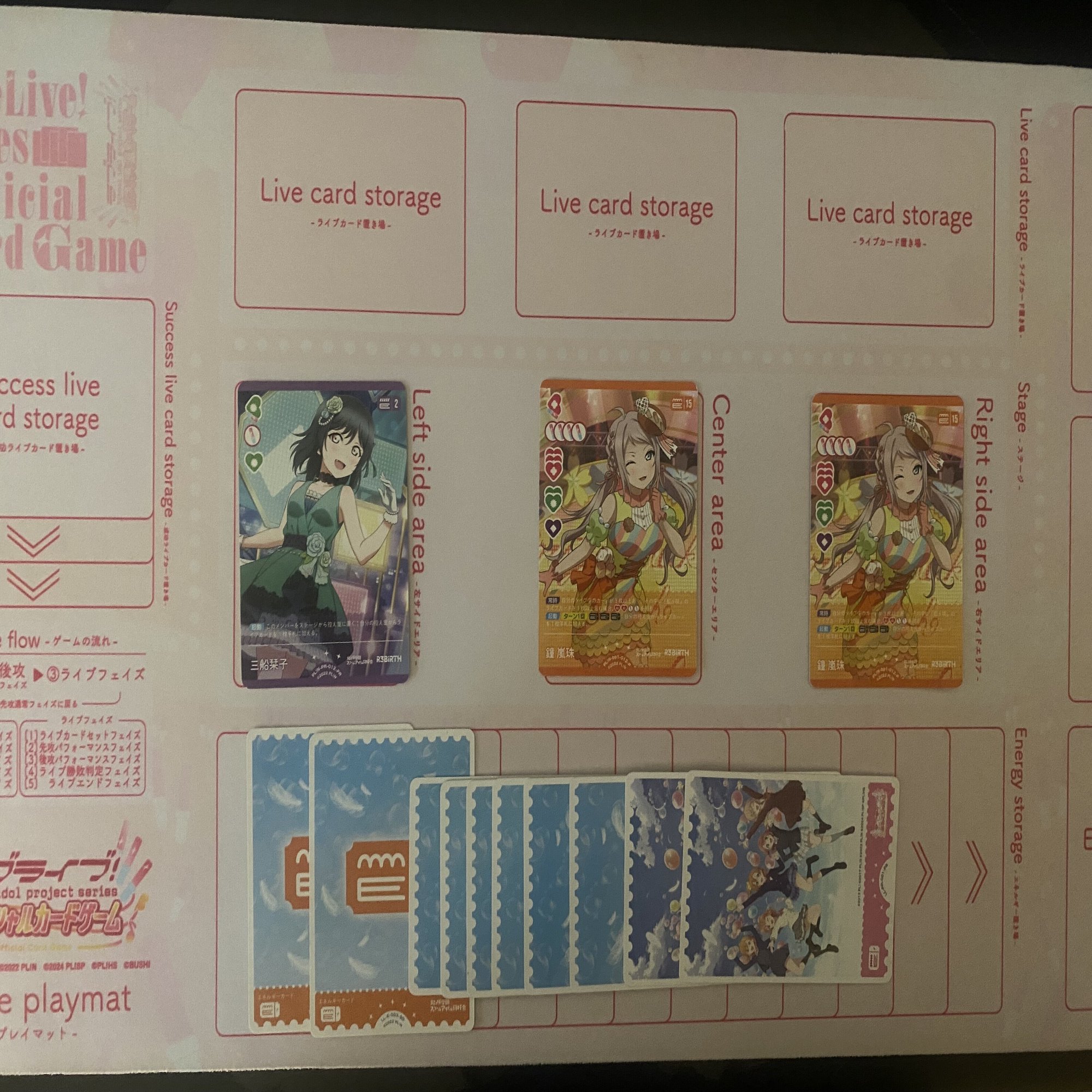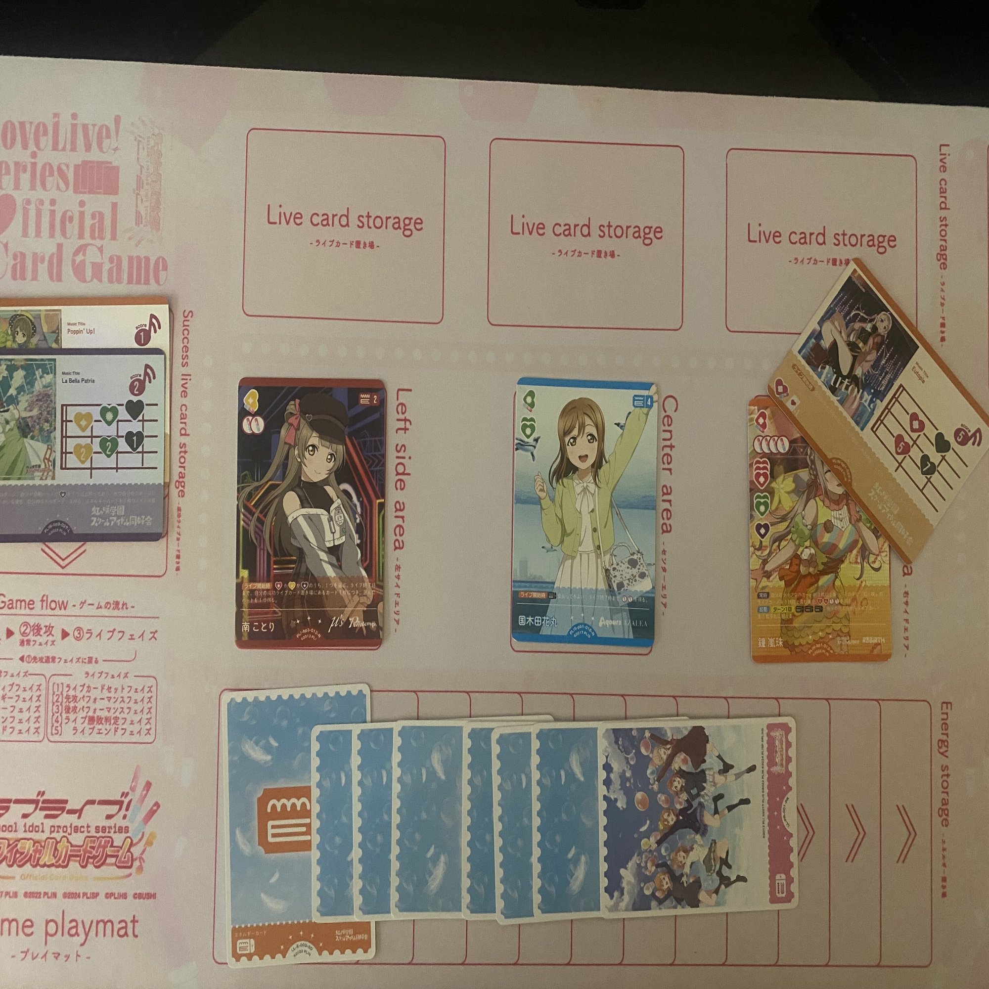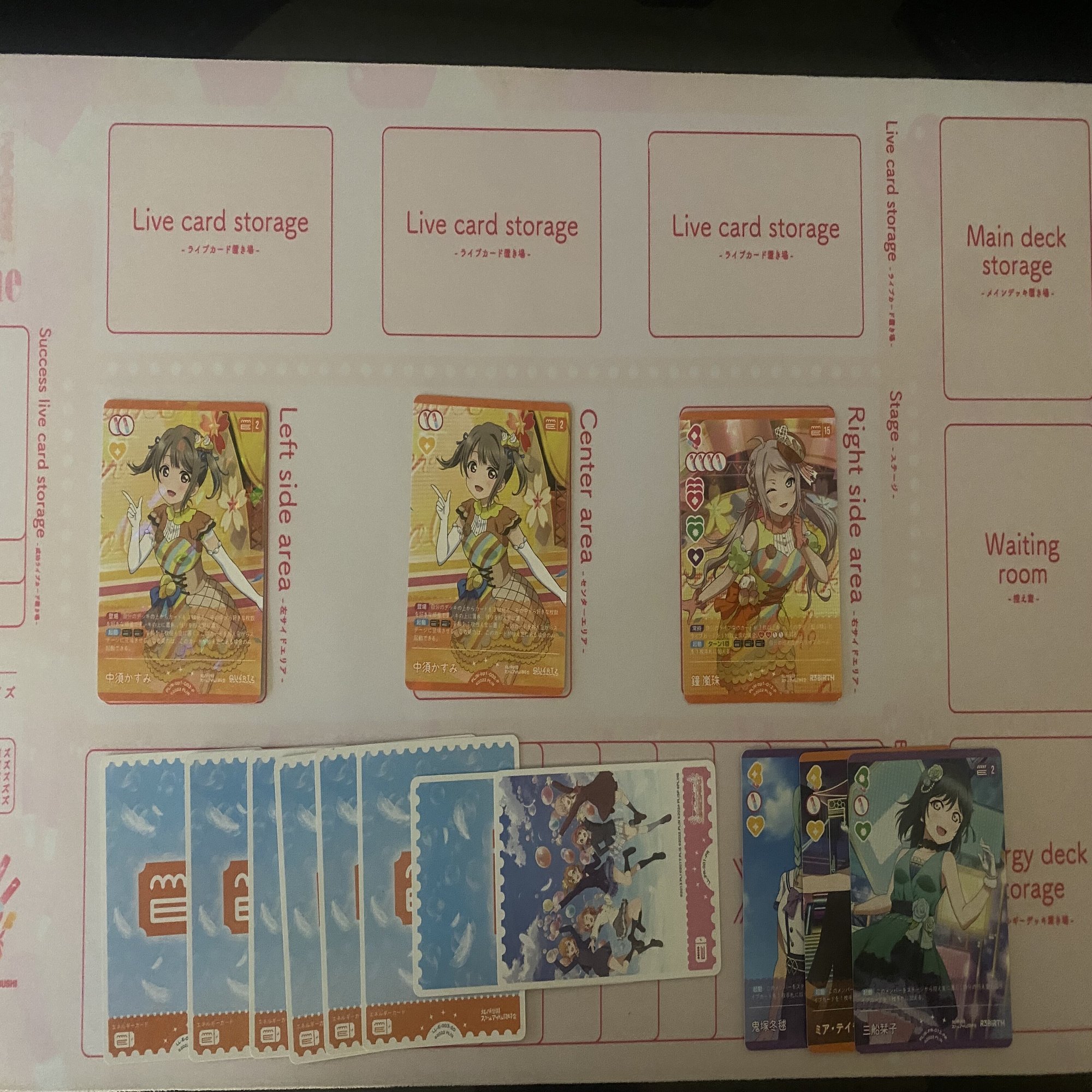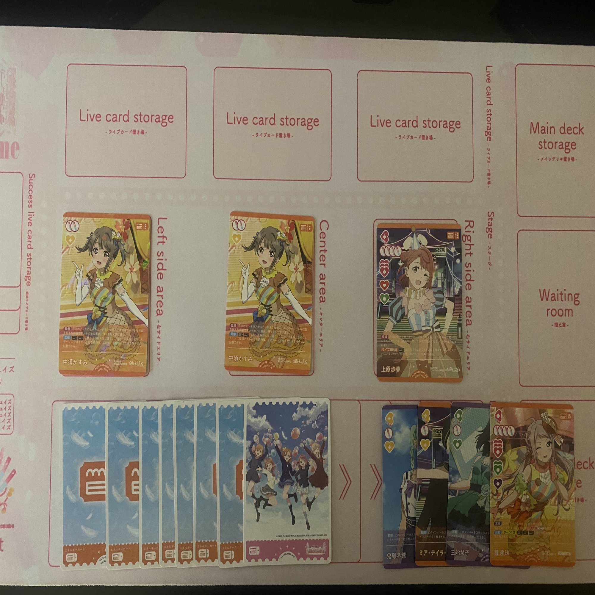 更に、《鐘 嵐珠》(コスト15)と《国木田 花丸》(コスト4)を登場した後、エネルギーが3個余るので《鐘 嵐珠》(コスト15)のライブ回収を1回行うことができます。