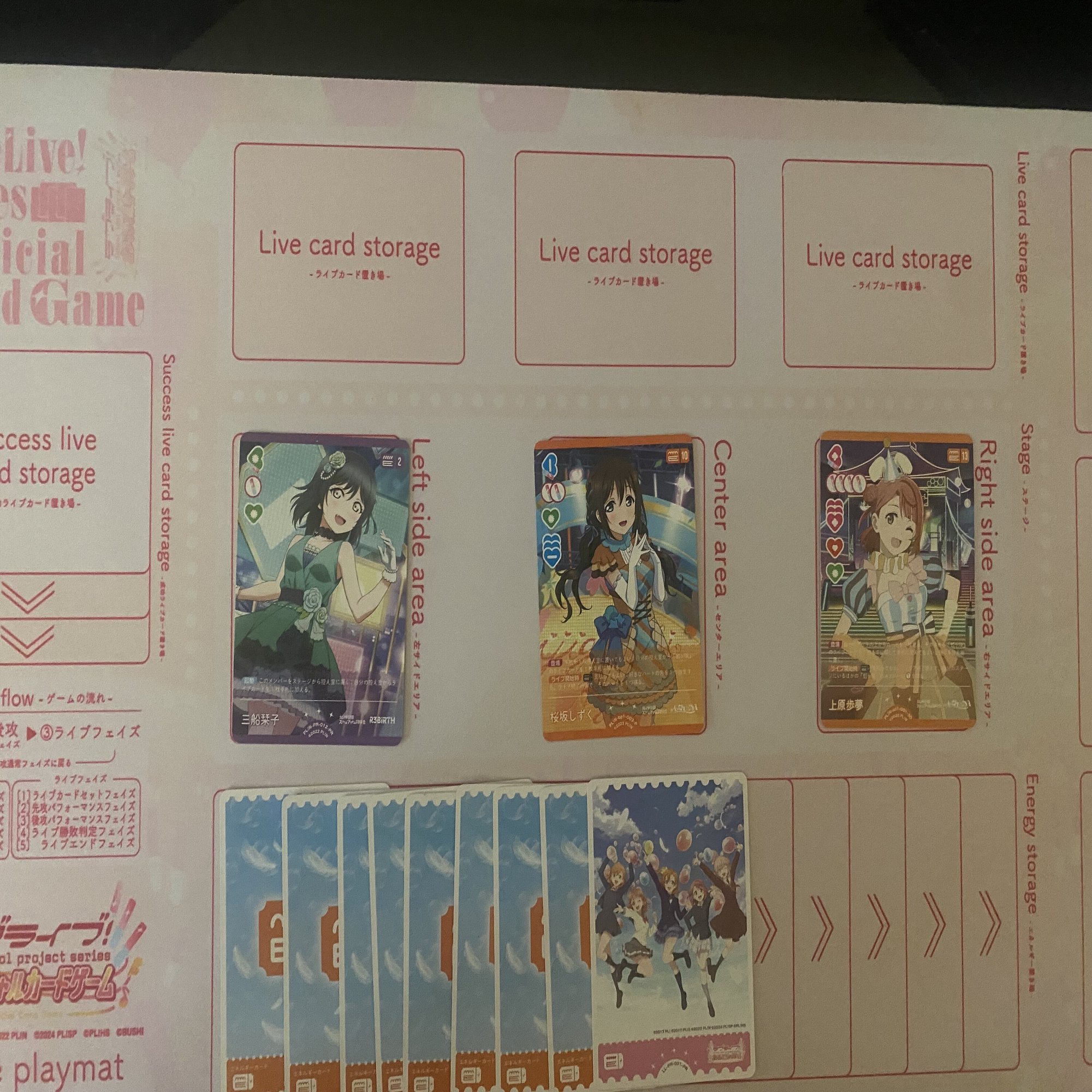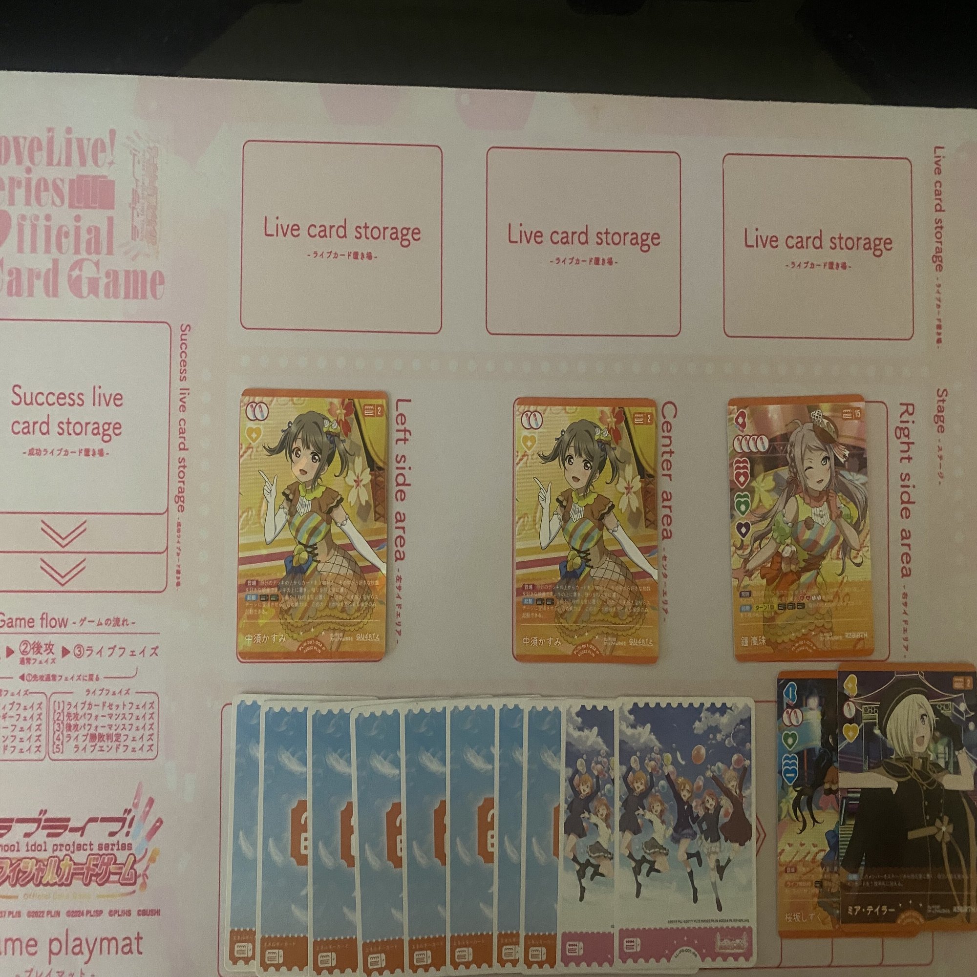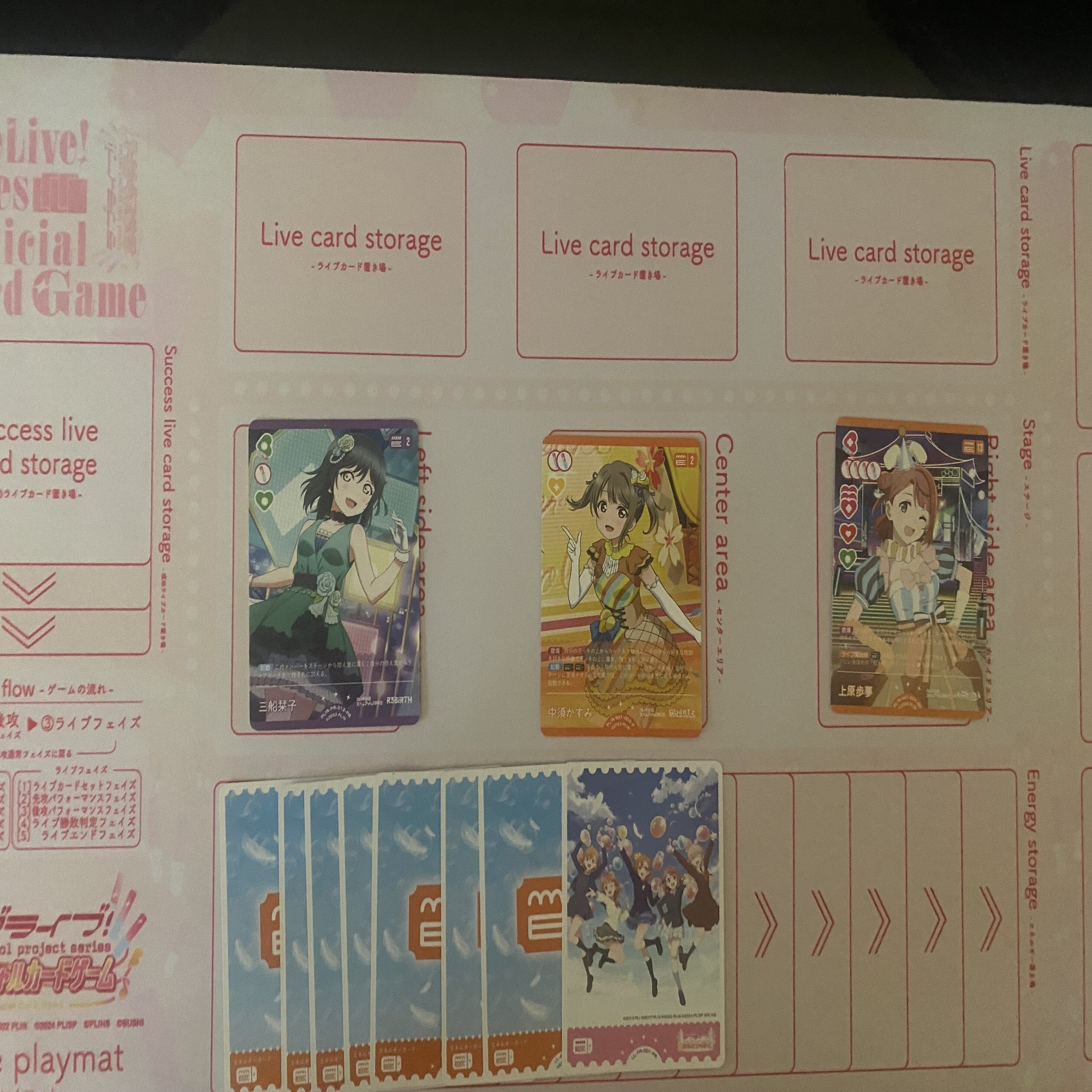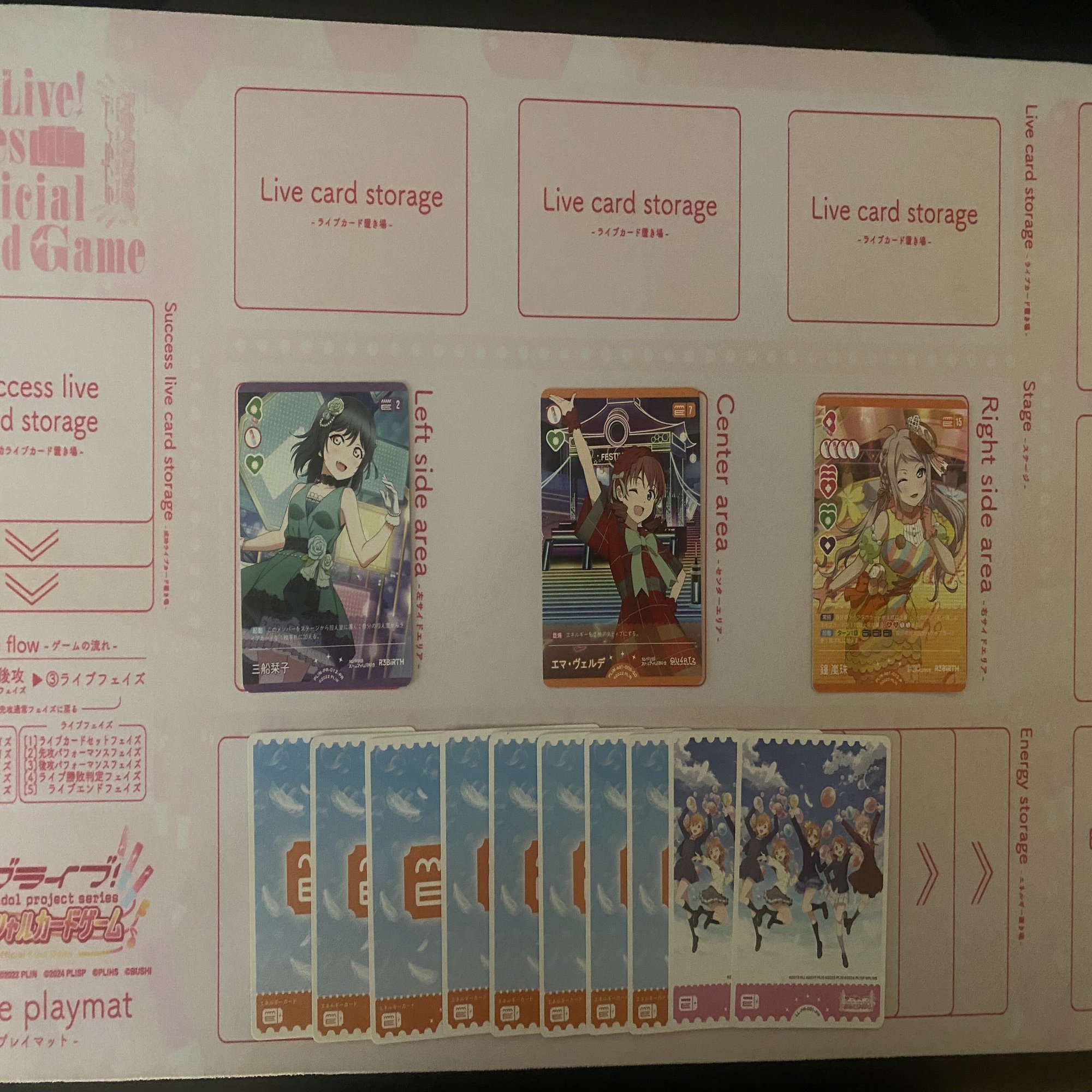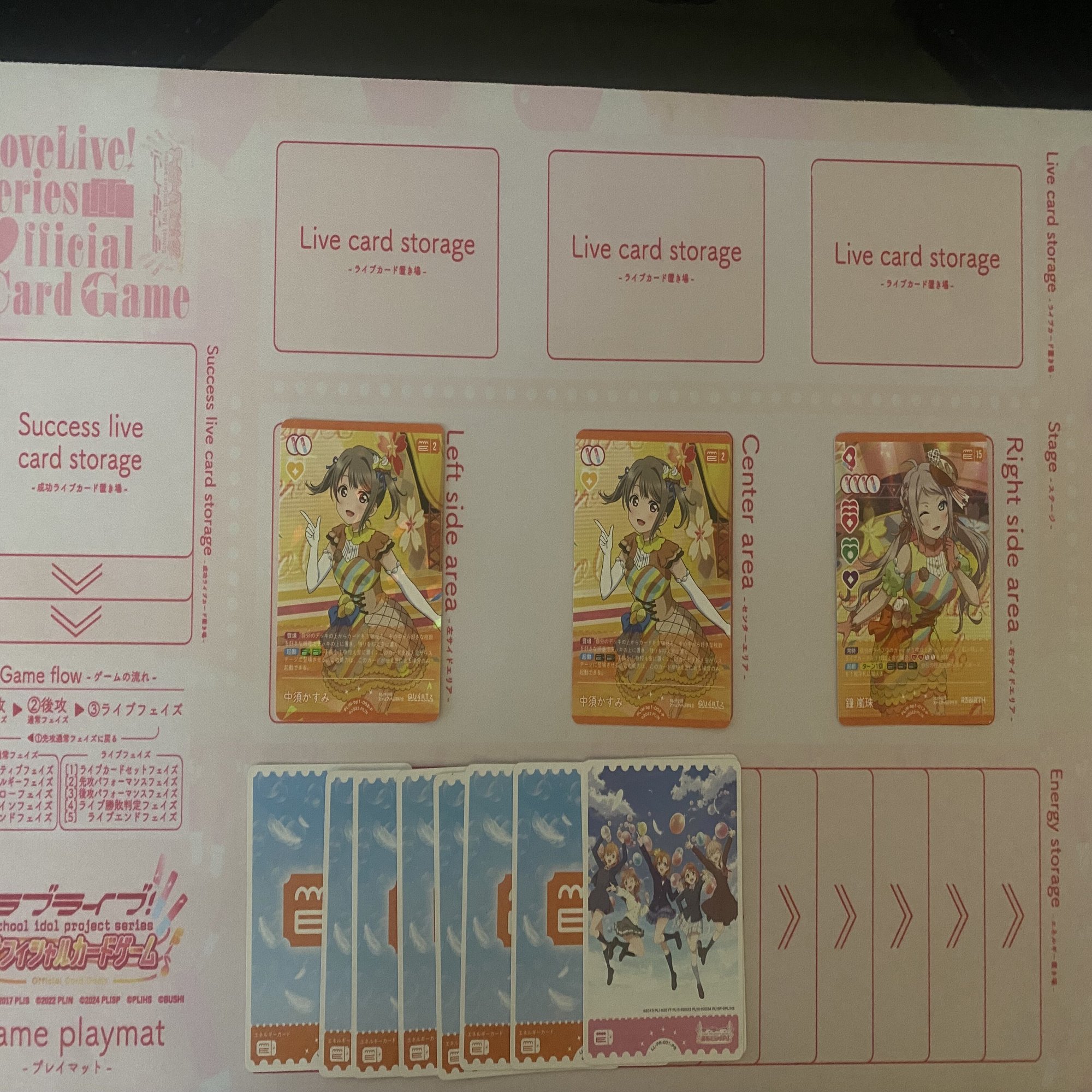 更に、《鐘 嵐珠》(コスト15)と《国木田 花丸》(コスト4)を登場した後、エネルギーが3個余るので《鐘 嵐珠》(コスト15)のライブ回収を1回行うことができます。