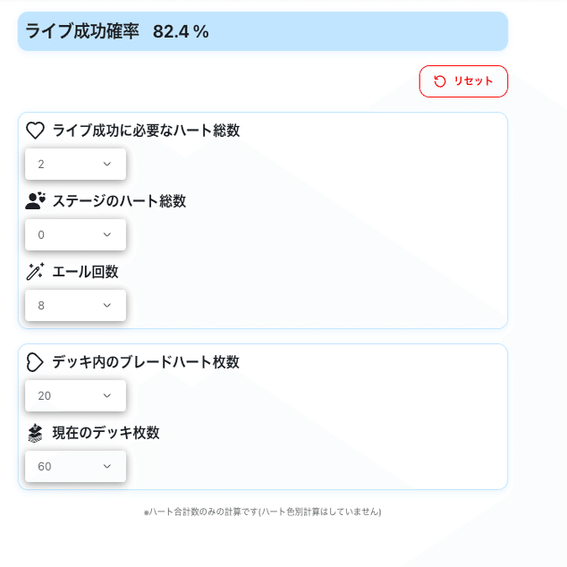 ラベランジュでは、ピンク色ブレードハート(ALL含む)の採用枚数が約20枚とやや控えめなため、3ターン目に2-2-13歩夢の《Eutopia》を実行する場合、ライブ成功率はおよそ80%程度となります。