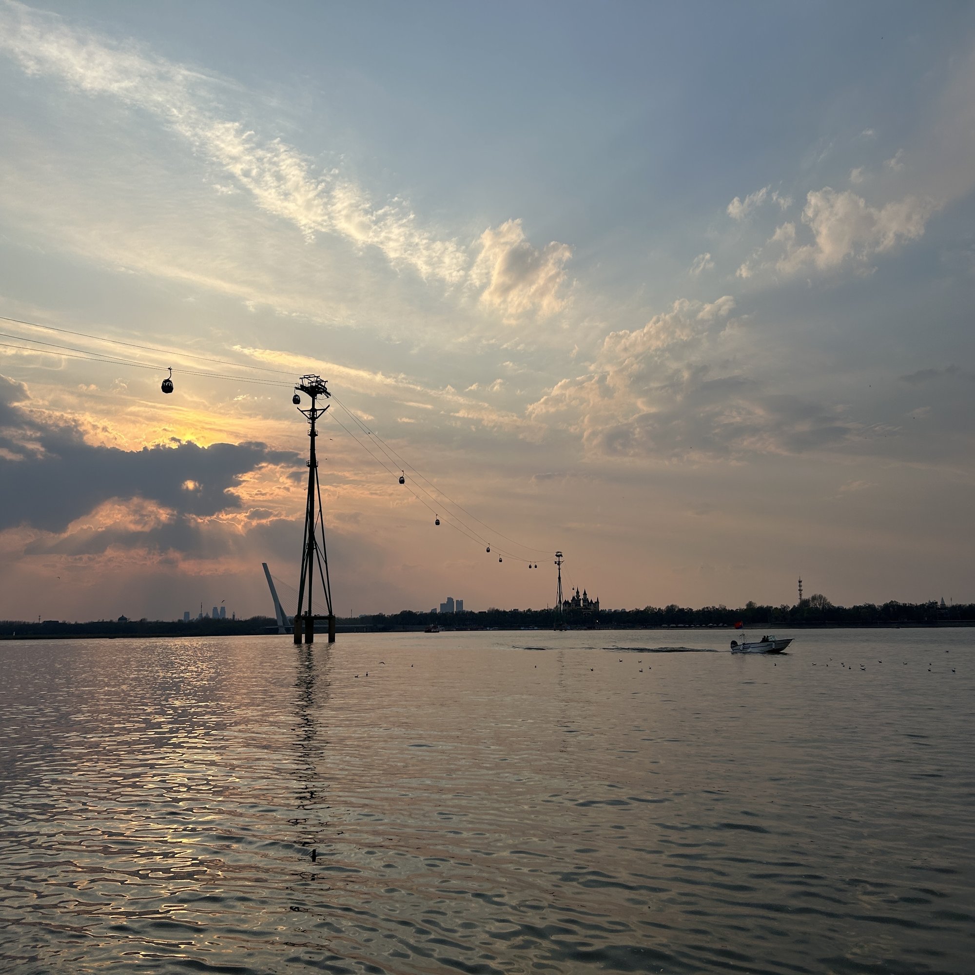 夕方になって、我が子と散歩へ出かけた。連れが少し体調を崩していたので、二人で部屋からは見えない松花江を眺めに行くことにしたのだ。夕焼けに赤く染まる空と、影絵のように浮かぶロープウェー。「明日ママが元気になったら、あれに乗ろう」と、約束する。