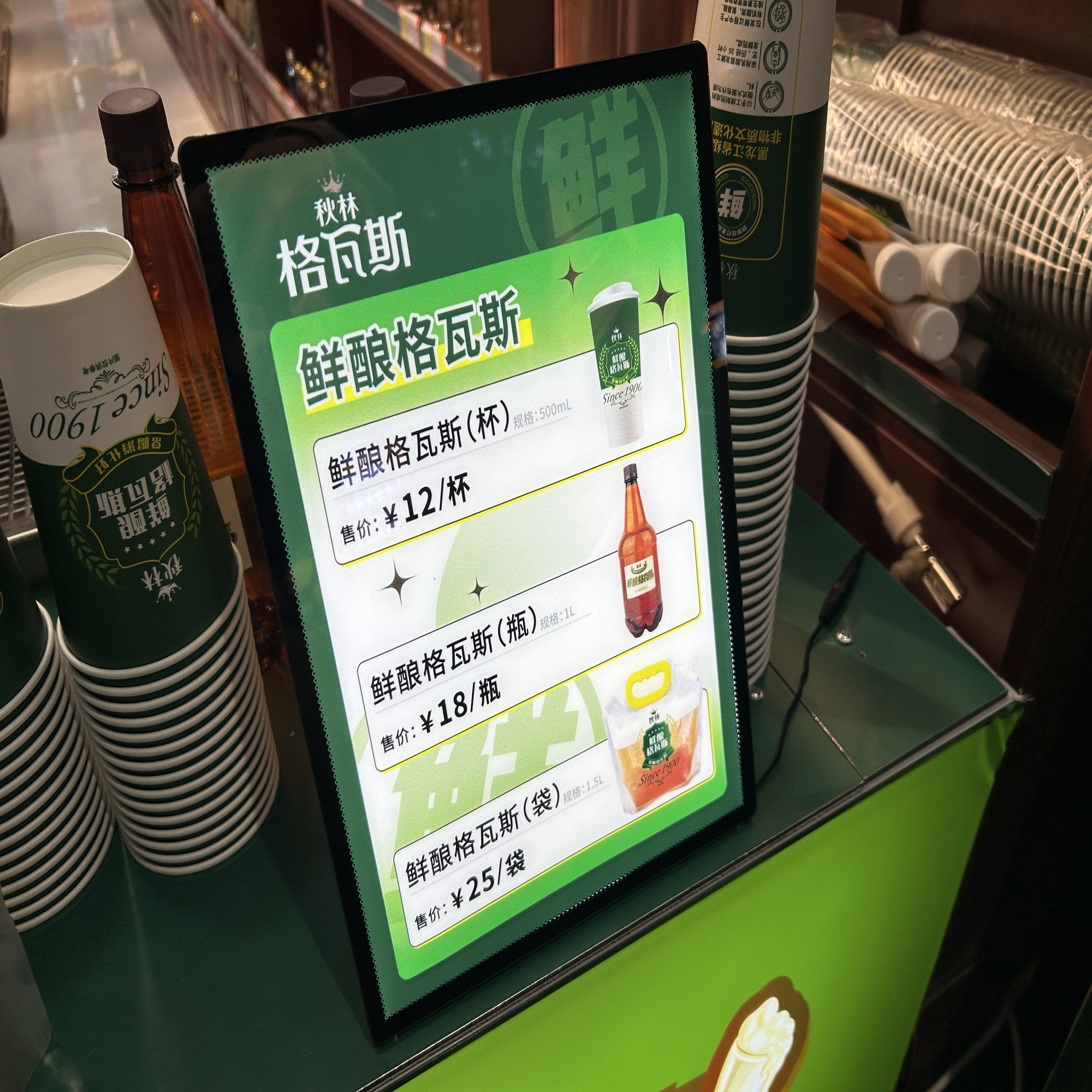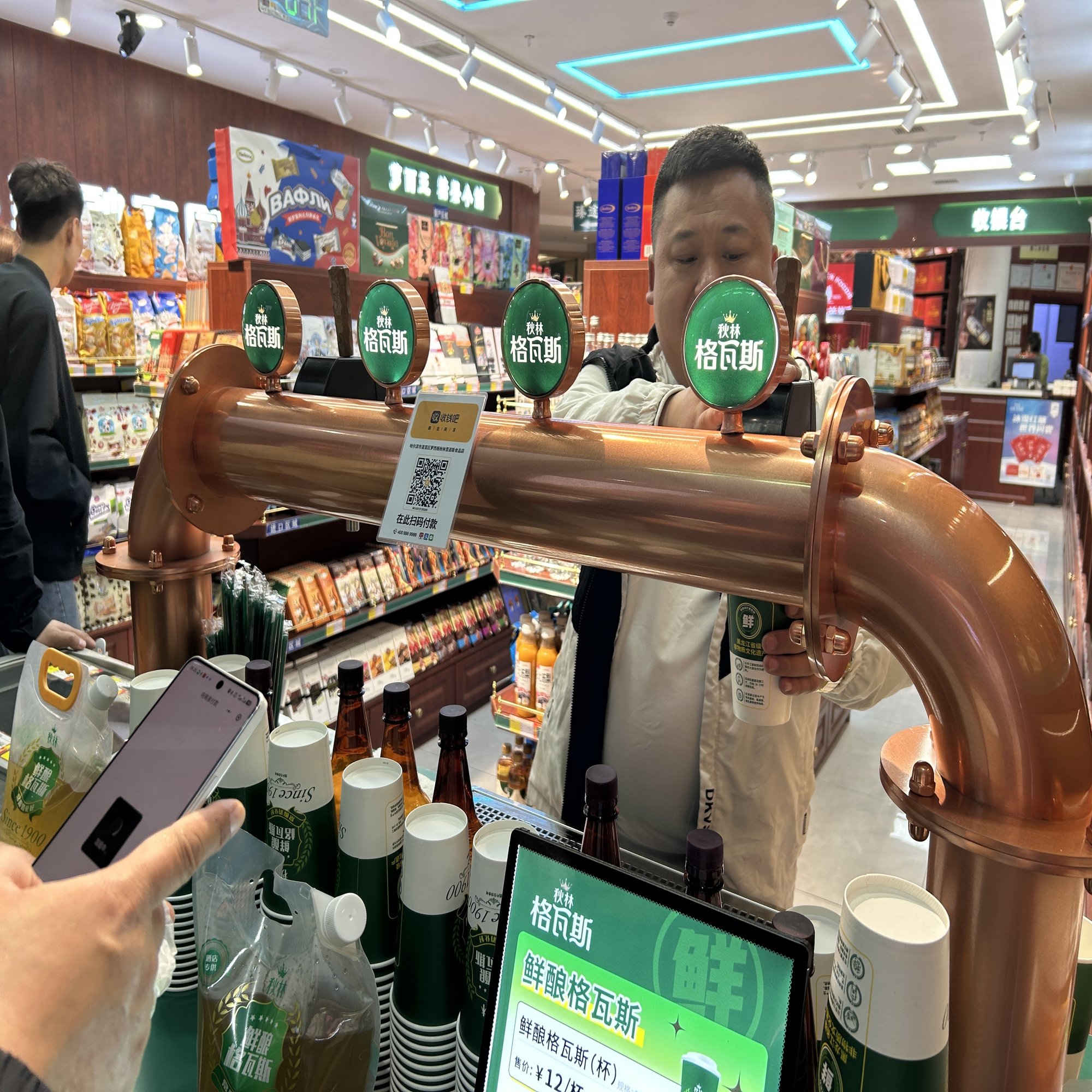 酒といえば、街のあちこちに、古式のビールサーバーのような装置を備えたドリンクスタンドがあった。 「现酿现打(その場で醸して、その場で注ぐ)」といううたい文句に惹かれ、ビールでも飲みながら歩こうかと近づいてみると、注がれたのはビールではなく、格瓦斯(クワス)だった。