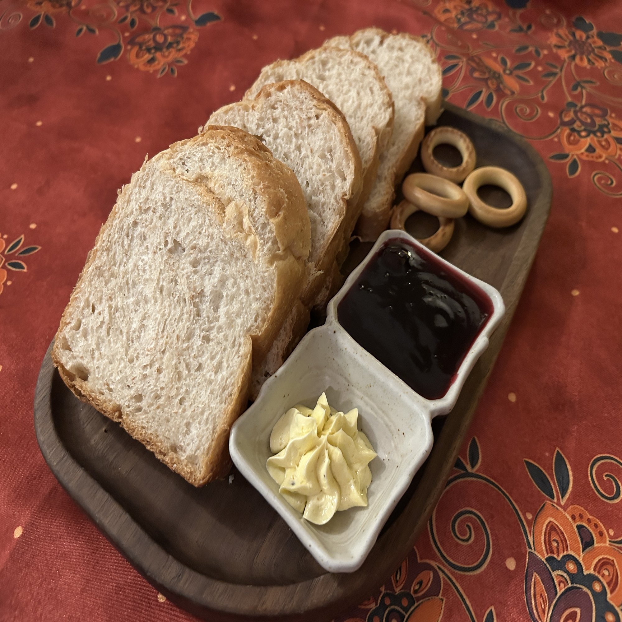 全麦面包は、全粒粉パン。パサパサで口の中の水分を持っていかれる系だが、スープに浸して食べれば悪くない。添えられたガーリックバターと、どこかチープなブルーベリージャムが、妙にこの店の空気に馴染んでいた。