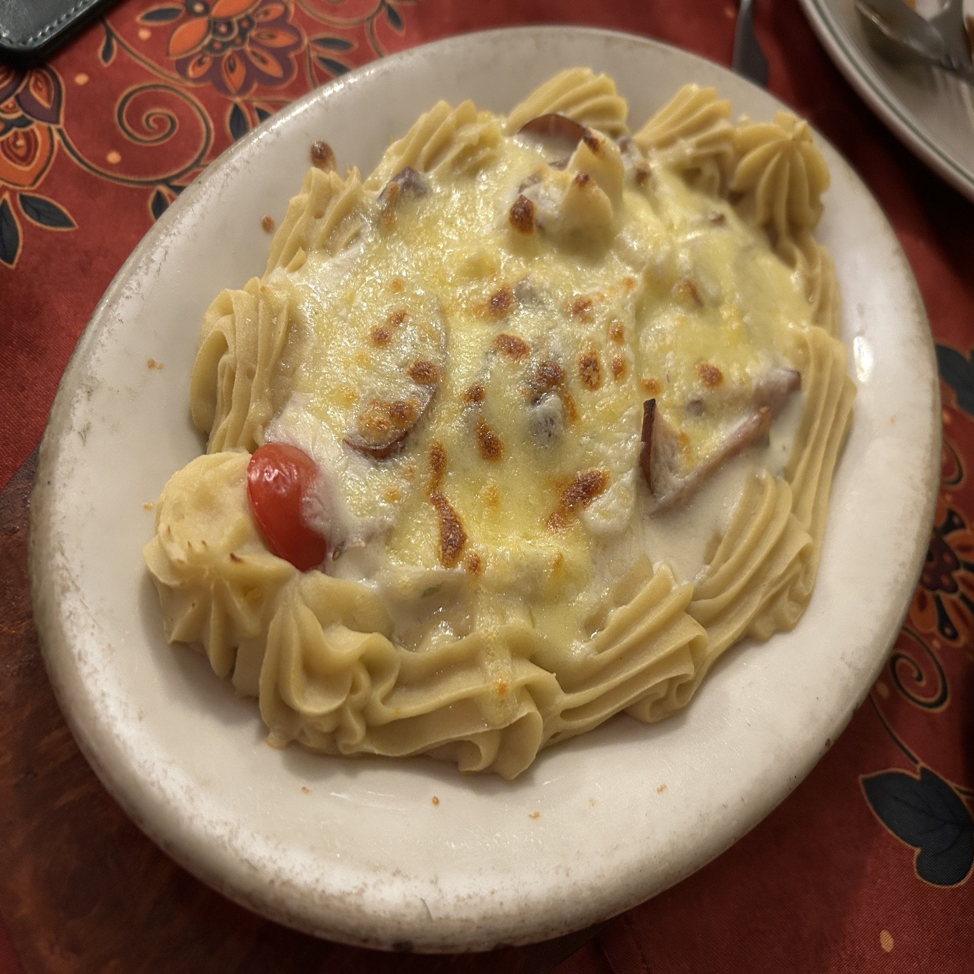 これまた名物の焗烤奶汁杂拌は、いわばソーセージのクリームソースグラタンで、五ミリ厚ほどの斜め切りがどっさり。燻香がしっかりしていて酒を呼ぶ味だ。チーズやクリームソースと一緒に食べても、塩辛すぎないのは好印象。周りのマッシュポテトと一緒に食べるのもよし。