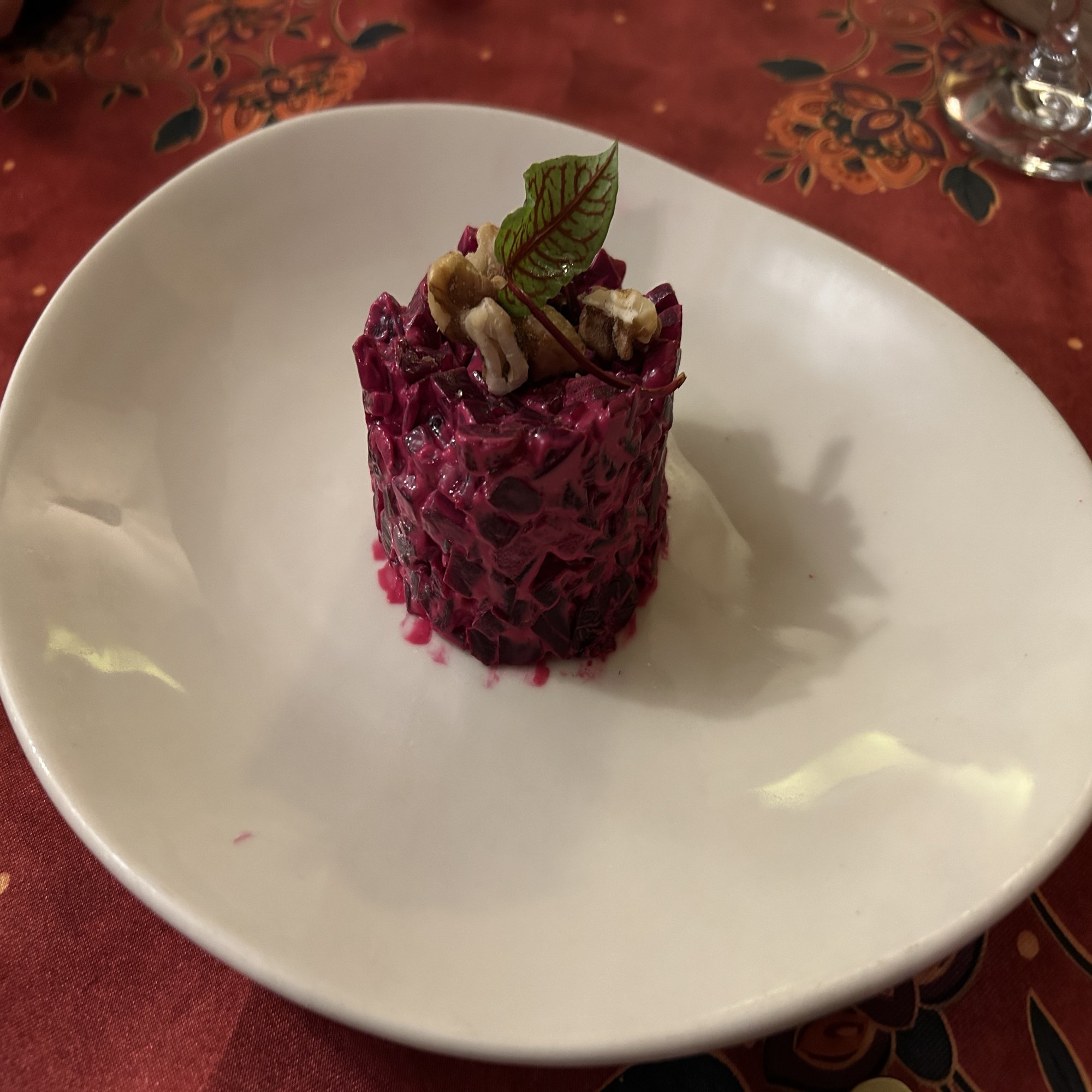 まずは俄式西梅红菜沙拉(ビーツのサラダ)。細かく刻んだビーツをマヨネーズ系のソースで和え、きれいな円柱状に成形してある。上にはナッツが散らされ、仕上げに赤い葉脈の走るレッドソレルが一枚添えられていた。