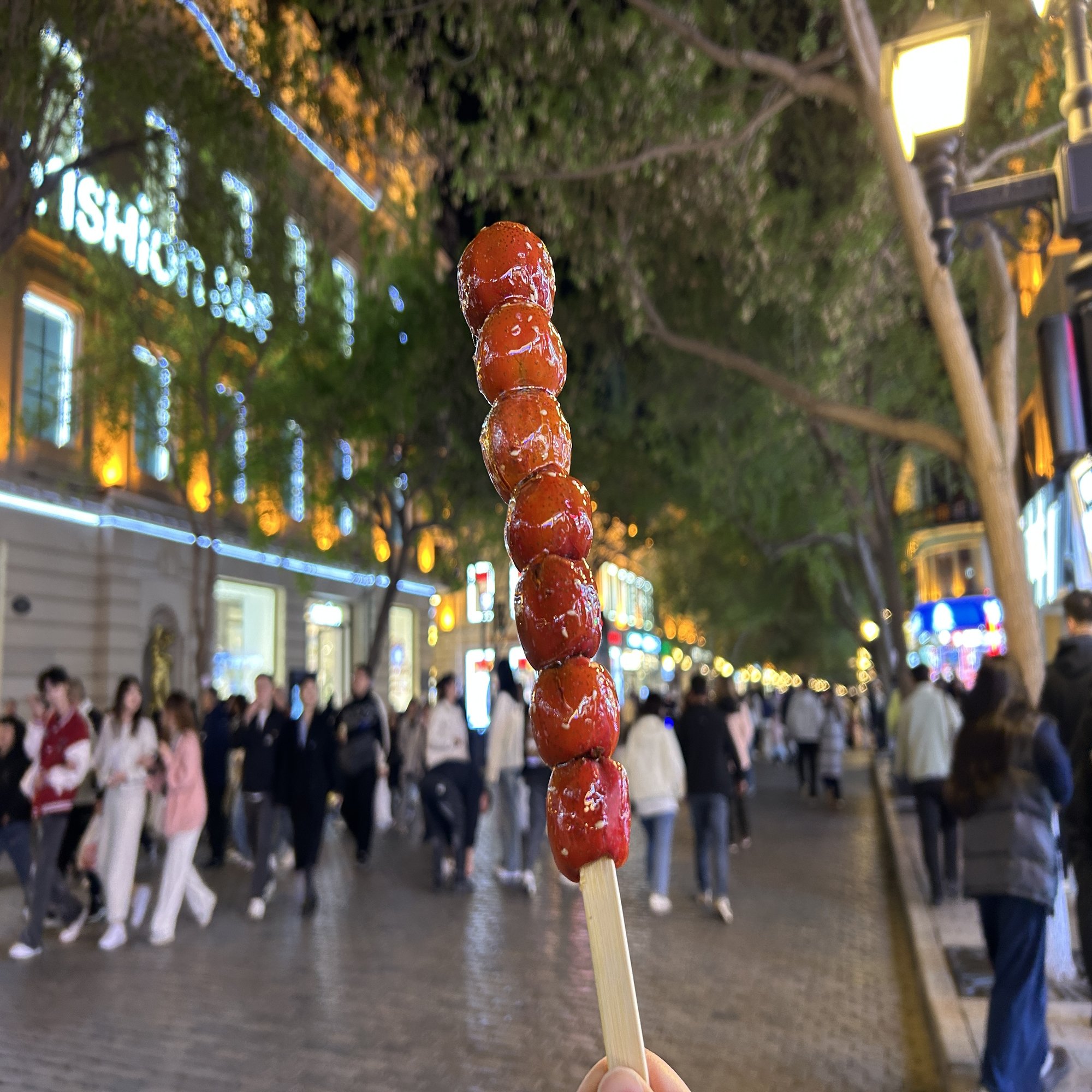 中央大街を歩いてホテルへ戻る途中、連れと我が子が冰糖葫芦(サンザシの飴がけ)の専門店へ吸い込まれた。店では我慢したデザートの代わりということらしい。