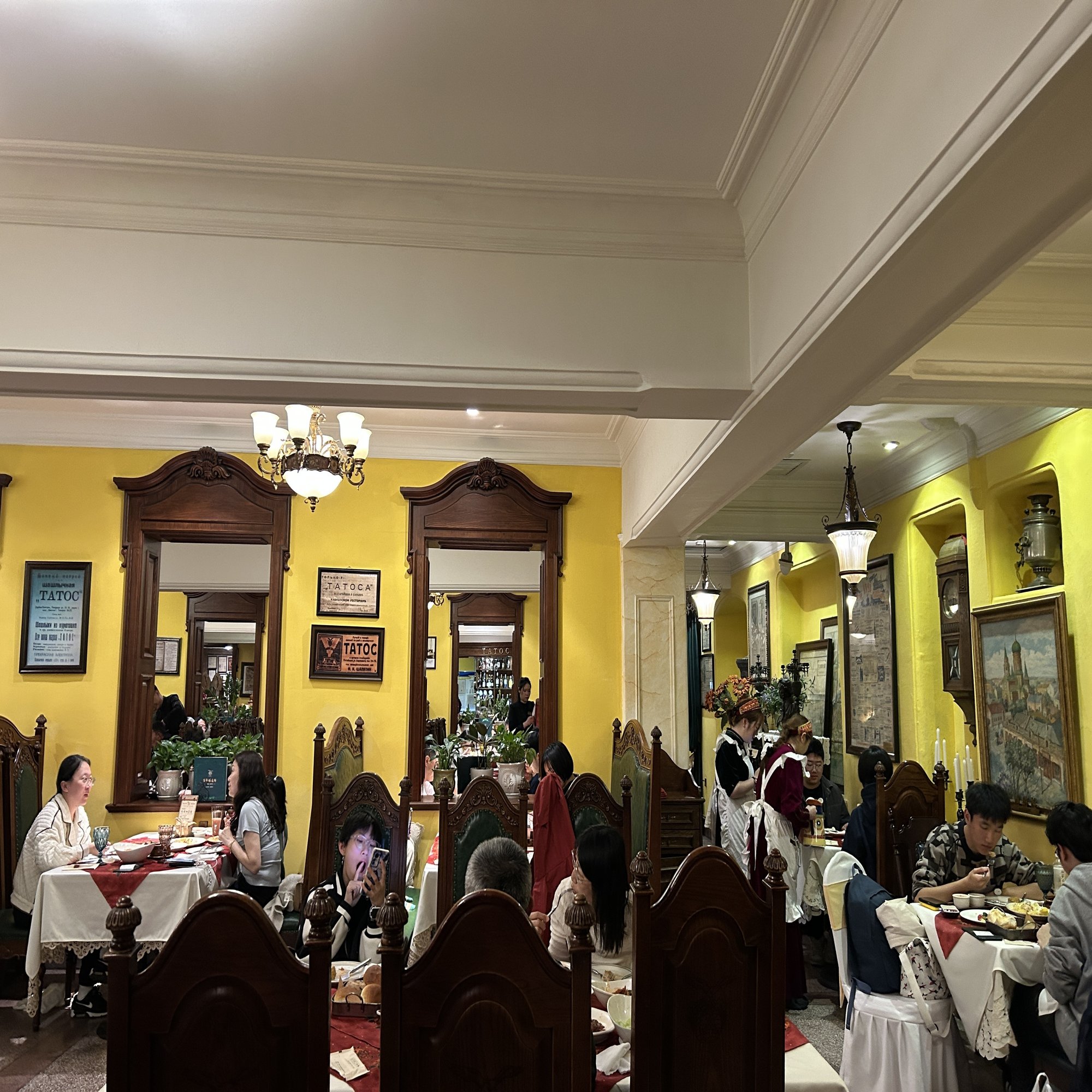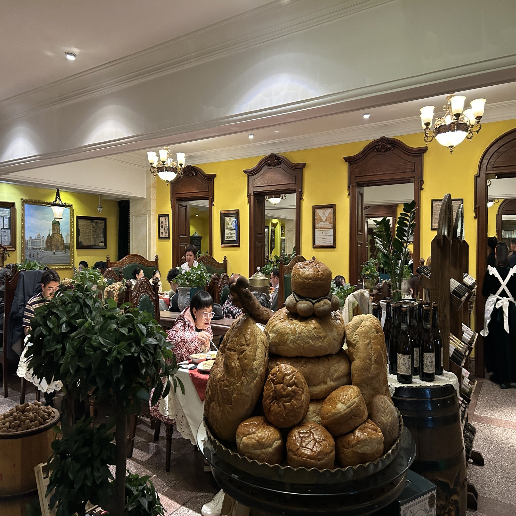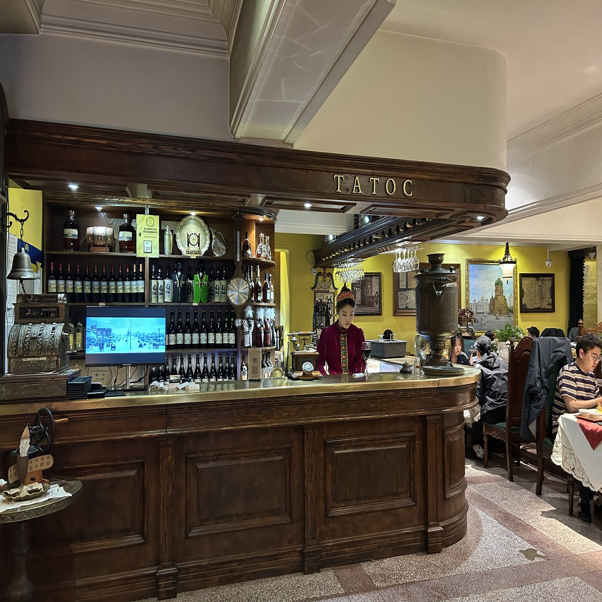 1920年に現在の中央大街へ移転し、時代の波の中で改名や休業を挟みつつも、2005年に創業名を復活させて再開。店内には百年の歳月を感じさせるロシア風の内装が残り、古い写真や年代物のピアノなどが、いかにも老舗らしい空気を醸し出している。