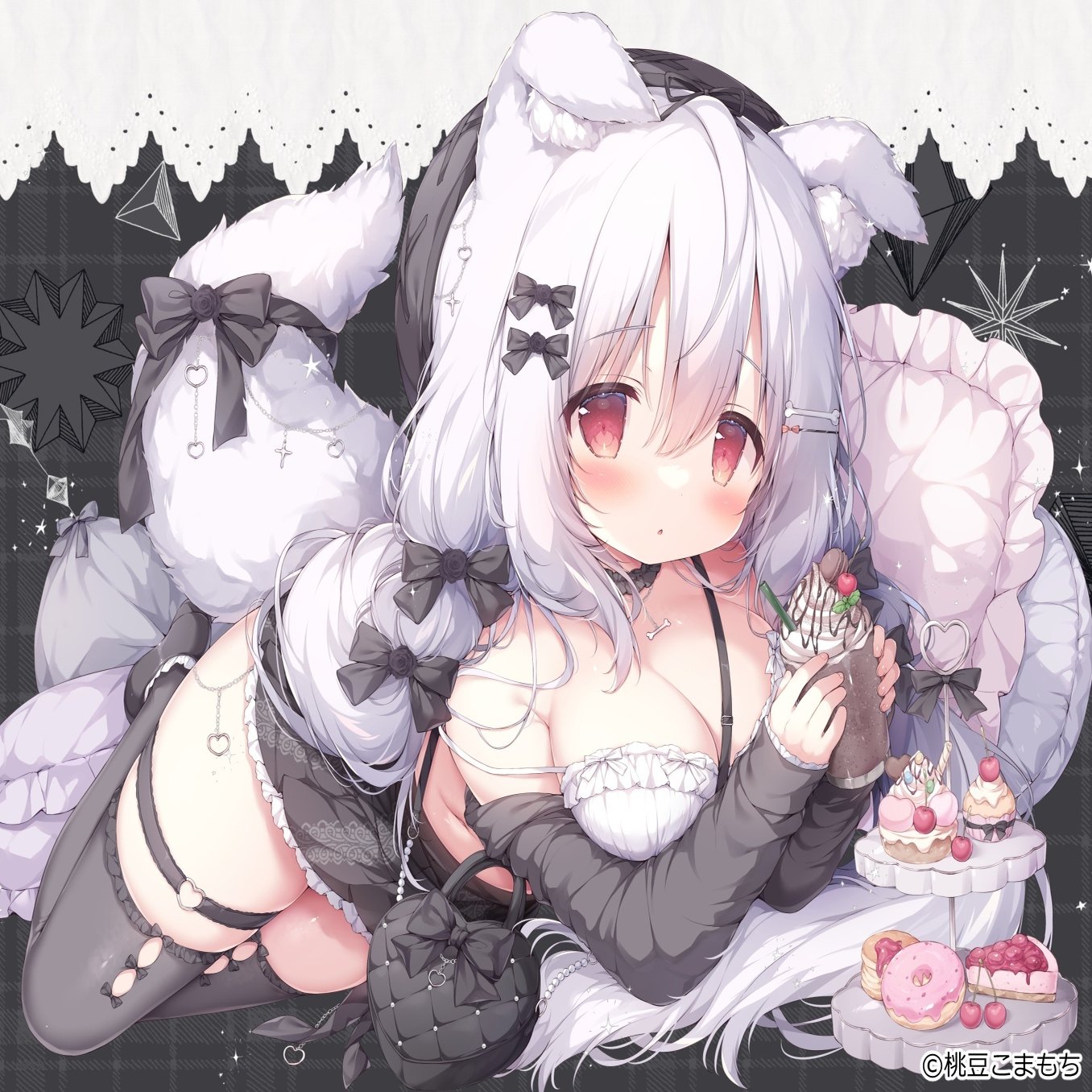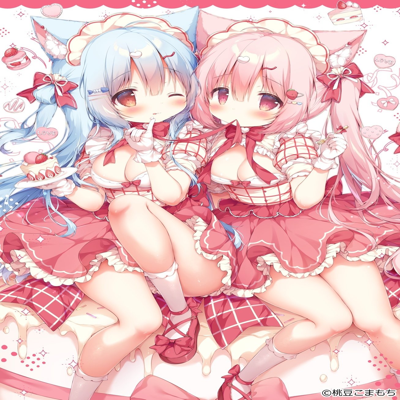 桃豆こまもち先生:このイラストのコンセプトはイチゴショートケーキです。ケーキの上にキャラクター自身がデコレーションとして乗っているイメージで描きました。