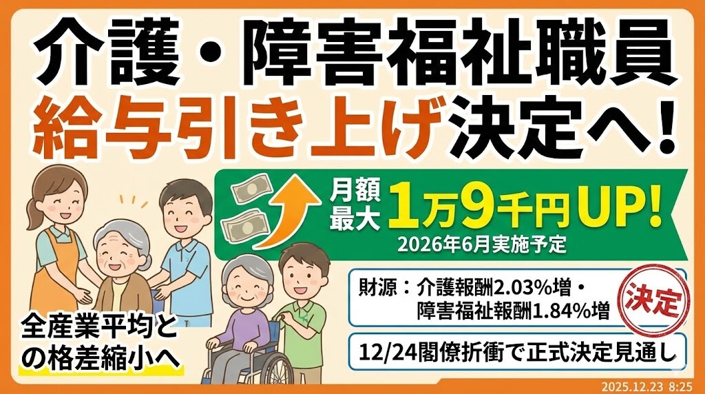 政府は、介護職員および障害福祉事業所職員の給与を、2026年6月から月額最大1万9千円引き上げる方針を固めた。賃金が全産業平均より低い現状を改善し、深刻な人手不足の解消を目指す。財源確保のため、介護報酬を2.03%、障害福祉サービス等報酬を1.84%臨時で引き上げる方針だ。24日に片山さつき財務相と上野賢一郎厚生労働相が折衝し、決定する見通しとなっている。