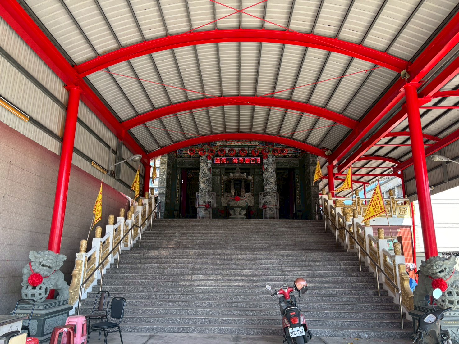 廟の目の前に、媽祖祭のお客さんの歓迎メッセージがかかげられた鉄骨があった。