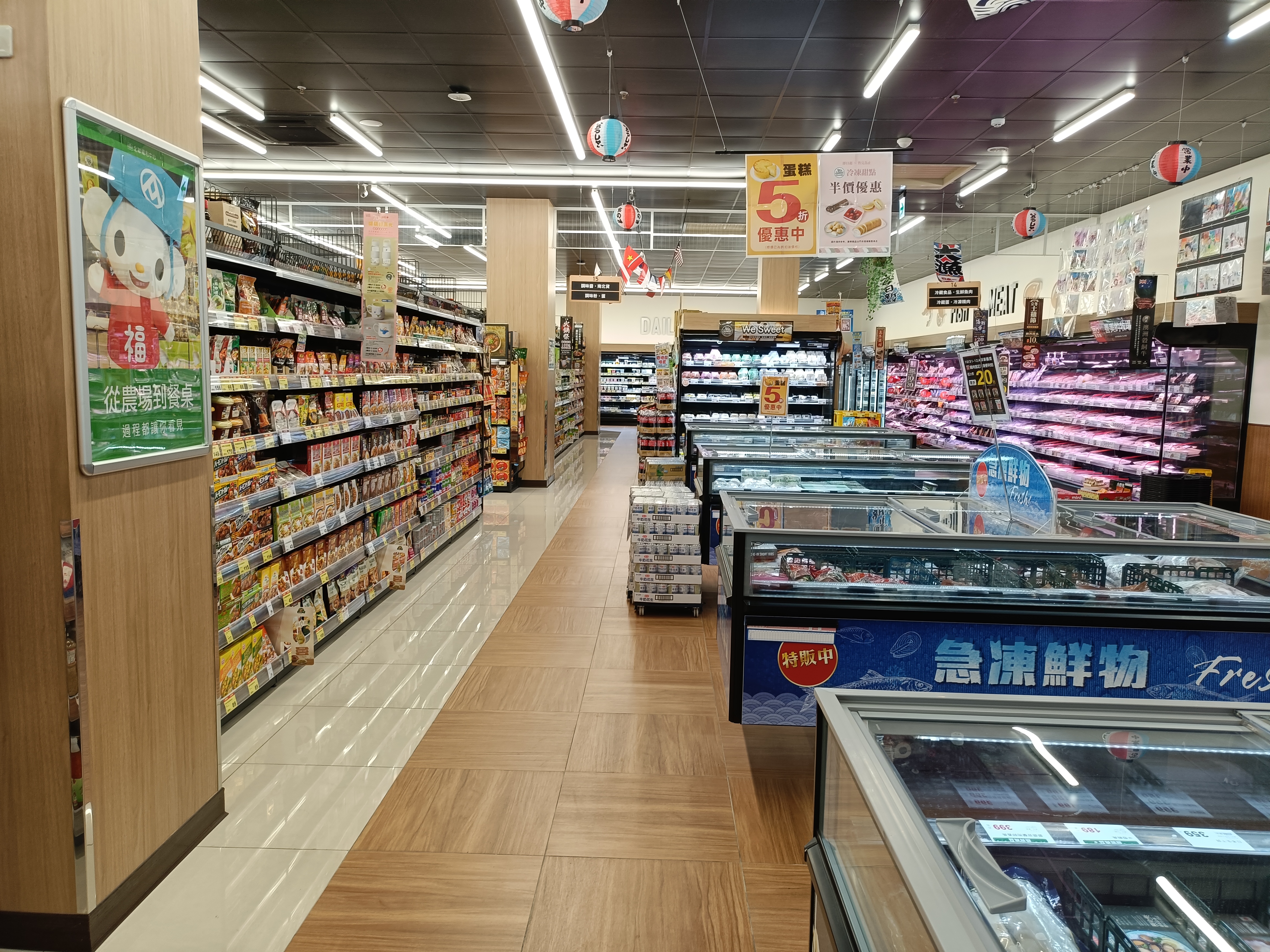 手前に野菜、進めば肉魚、レジ前に広がるお菓子とレトルト食品。