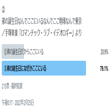ナギ:この歌はアンケートで「弟の誕生日なんでここにいる」の「なんで」の捉え方についてお聞きしました。「弟の誕生日だからここにいる」のように、理由を述べる意味の「なんで」と捉えたのか、または「弟の誕生日になぜここにいる」のように、理由を問う「なんで」だと捉えたのか。