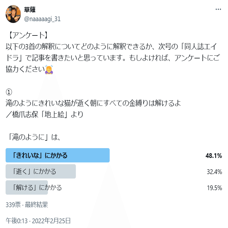 ナギ:アンケートでは、「滝のように」がどの単語に掛かると考えたかについてお聞きしました。339人の方にお答えいただいたのですが、「きれいな」に掛かると答えた人が48.1%(163人)、「逝く」に掛かると答えた人が32.4%(110人)、「とける」に掛かると答えた人が19.6%(66人)でした。