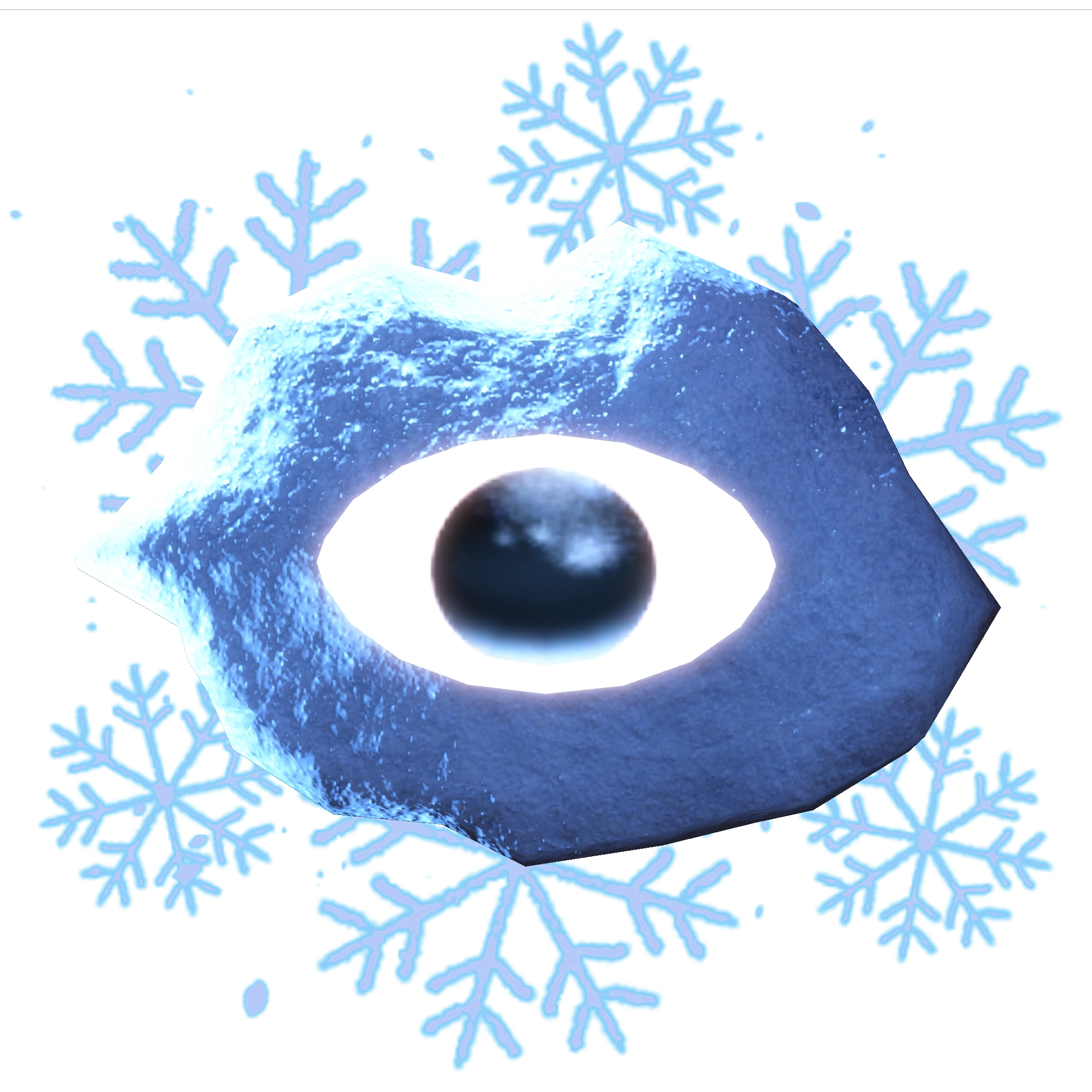 Snow Seek's eyes appear as little mounds of light-blue snow with snowflakes sticking out from their edges. There is an eye with one black pupil in the center of each mound.
