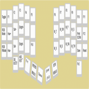 左下のNキーとMキーのところにあるのは、マウスボタン左クリックと右クリック。これはちょっとトラックボールから離れていてボールから親指が離れてしまうので、キー一つずつ右にずらしたいと思っている。また自動マウスレイヤーにも挑戦したい。