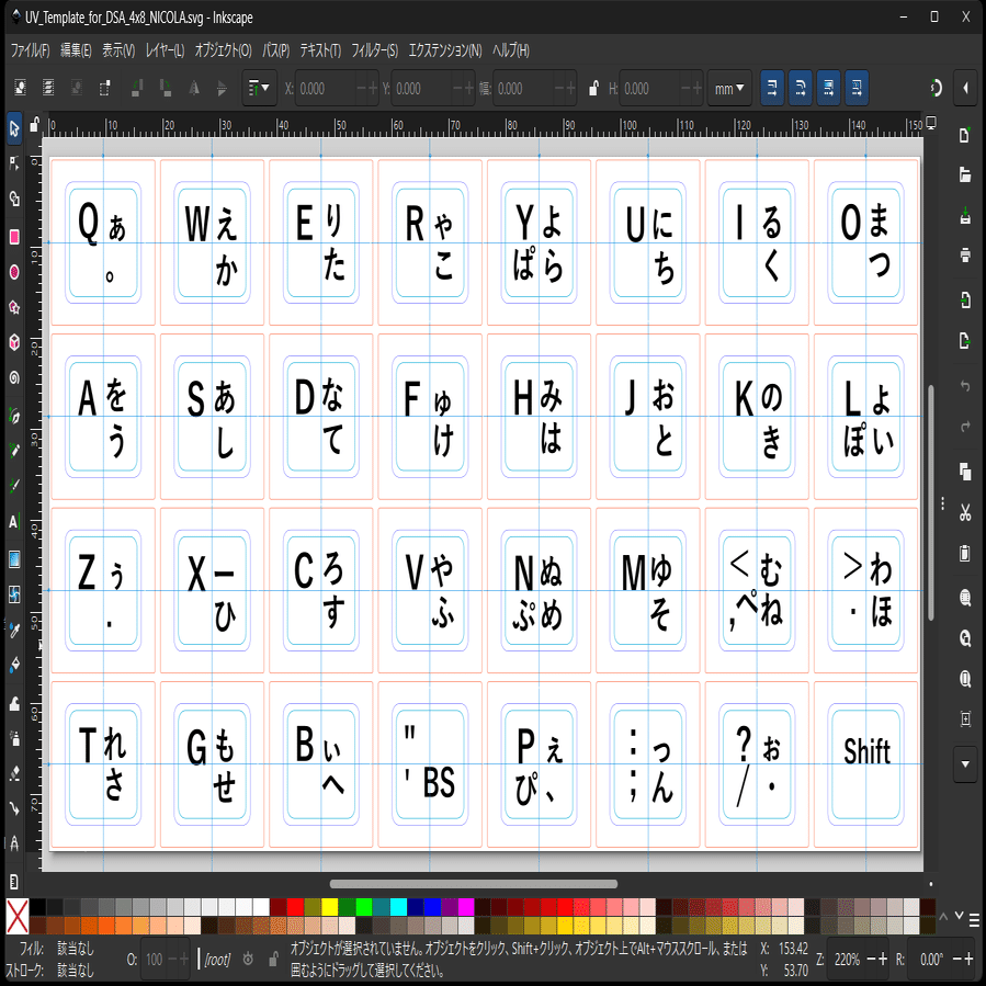 キートップに印刷するデザインは発注者自身がデザインファイルを用意する必要がある。ファイルフォーマットは、Adobe Illustrator, Affinity Designer 2, Inkscapeの中から選択しテンプレートが用意されているのでこれをダウンロードして自分用のデザインを作成する(下図参照)。親指シフトのレイアウトは、ANSI(US)キーボードを親指シフトにしたときのNICOLA-A。Inkscapeは基本的に無料で使用できるのでこれにした。UV印刷は多色が可能だがキートップ印刷なので無難な黒にした。日本語フォントも飽きの来ないYu Gothic UI、英語フォントはArial。
