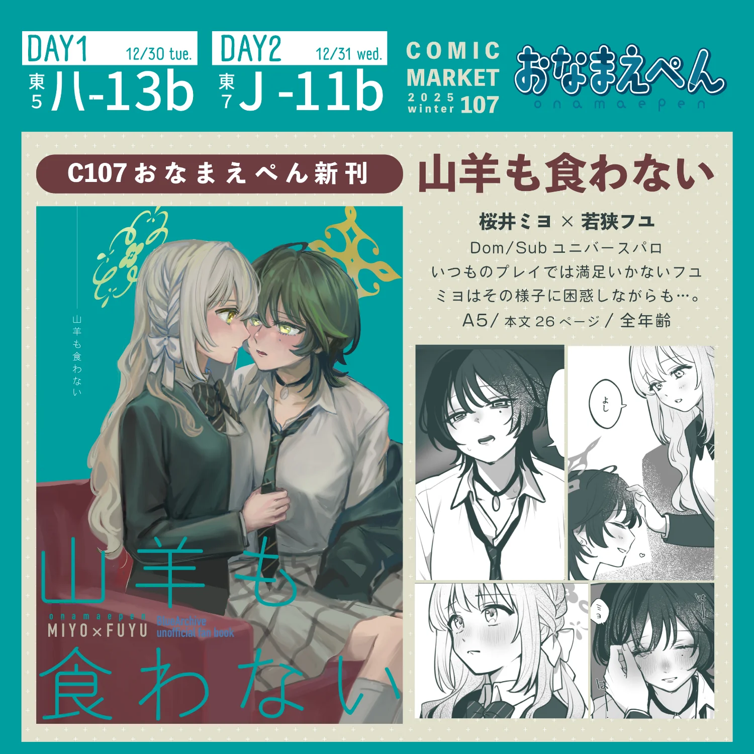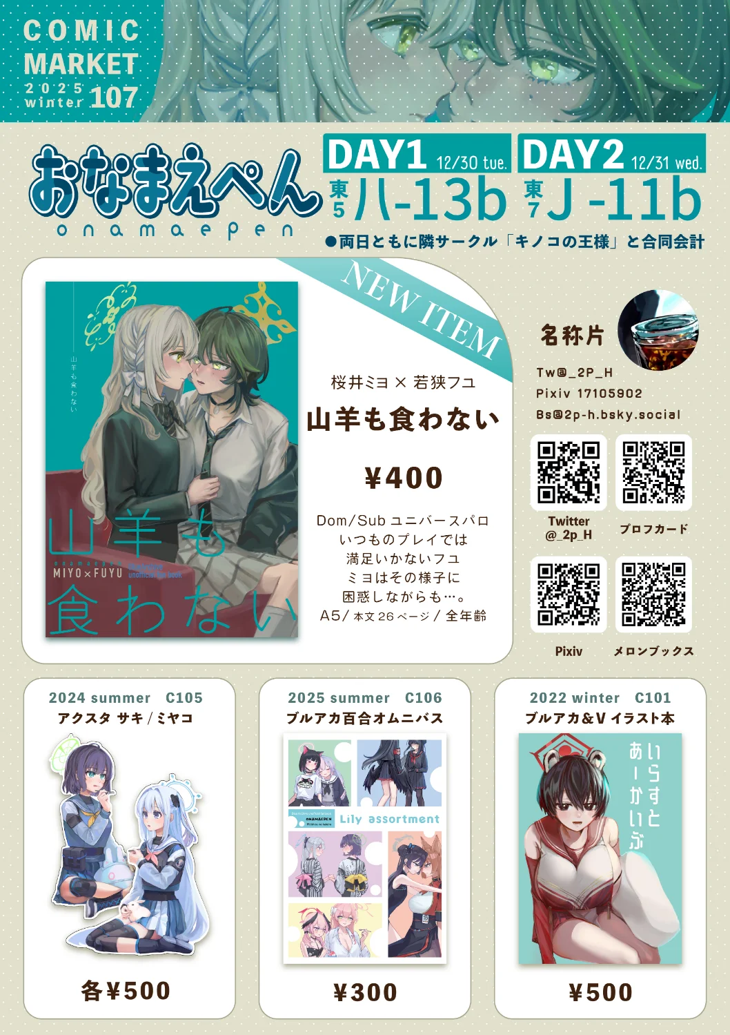 名称片@MeishounoKakera@mivatter.com2分前MivatterC107おしながきサークル おなまえぺんDAY112/30(火) 東5ホール ハー13bDAY212/31(水) 東7ホール Jー11b新刊はミヨ×フユ本です色紙と、間に合えばミヨフユペーパー…です!1