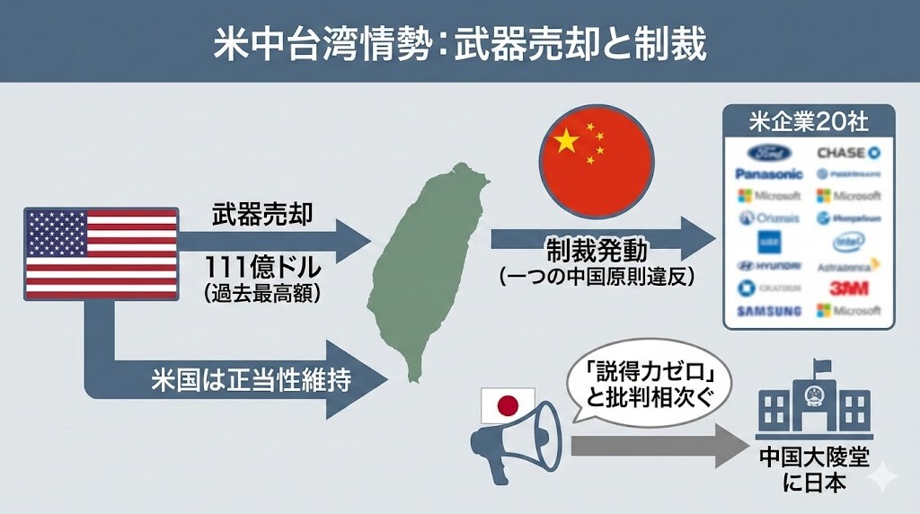 トランプ米政権は、台湾に対し総額約111億ドルに上る大規模な武器売却を承認した。これに対し中国外務省は、米軍需関連企業20社とその上級管理職10人に対して対抗措置を講じることを決定し、駐日中国大使館もXを通じて「台湾問題は越えてはならないレッドラインである」と強く警告した。米国務省はこの制裁に対し「強く反対する」と反発を強めている。