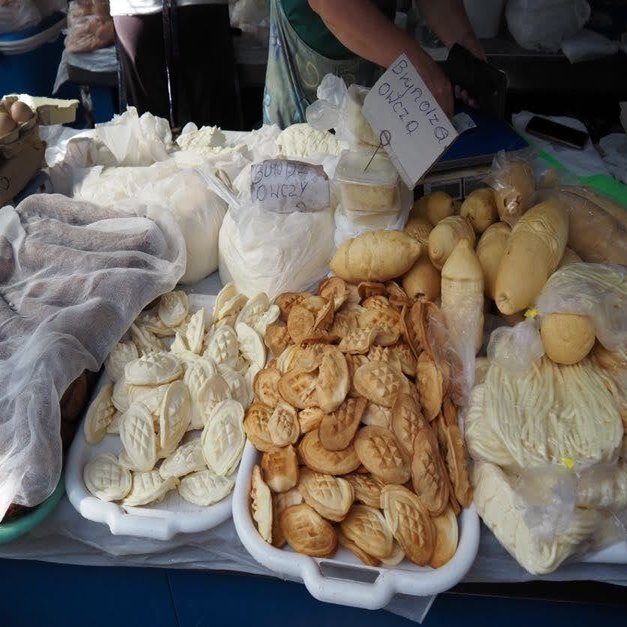 まずはチーズがお出迎え。パンみたいなのは、ポーランド南部の山岳地帯で作られる、オスツィペック(Oscypek)という羊のチーズ。後ろのビニールに入っている生チーズが元のチーズで、型に入れたものは乾燥させ、保存性を高めています。色つきはスモークタイプ。筒状や紡錘形など形もさまざまです。