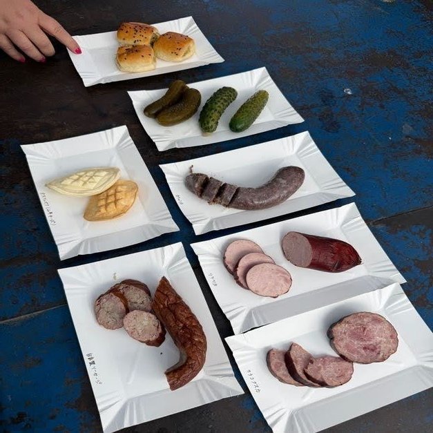 アテンドのアグニェシュカさん、なんと市場に紙皿とナイフを持ってきていました!空いていた屋台の上で買ったものを広げて試食。ソーセージやチーズ、ピクルス、フルーツやパンなど、ポーランドらしい食品を体験できました。