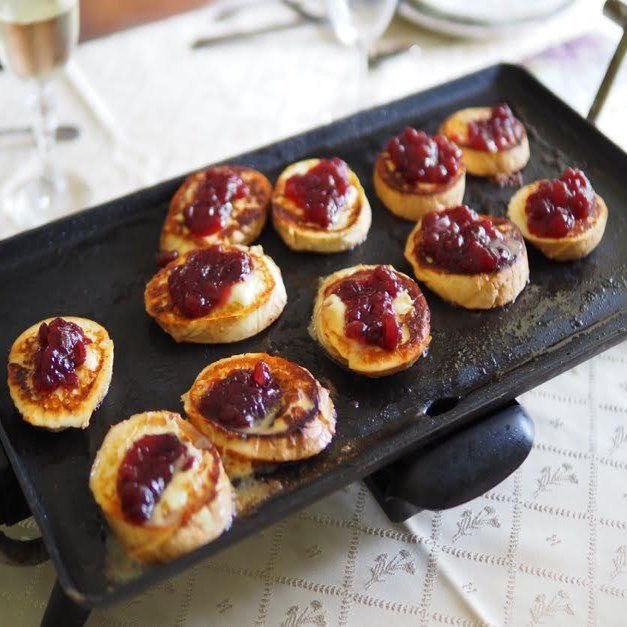 なんとも可愛いオードブル!クラクフの市場で見たオスツィペック(Oscypek)の筒状のものを薄切りにし、フライパンで焼いてクランベリーのジャムを乗せたもの。こんなふうにして食べるんですね。ワインが進みます。