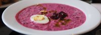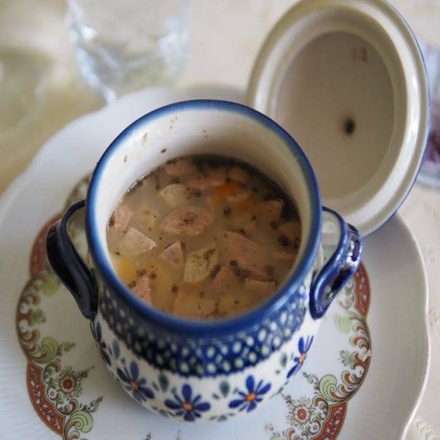 ジュレック(Żurek)は、ライ麦を発酵させたジュル(Żur)を味付けに使った、ポーランドの代表的なスープで、白ソーセージとスメタナというサワークリームが入ります。ヴォイチェフさんが、鶏・七面鳥・ベーコン・牛肉を2日煮込んで脂をのぞいた肉のだしに、だし野菜も加えてとった、なんとも贅沢なブイヨンをベースに手作りしたもの。ジュルは市販の瓶入りのものを加えているということでした。