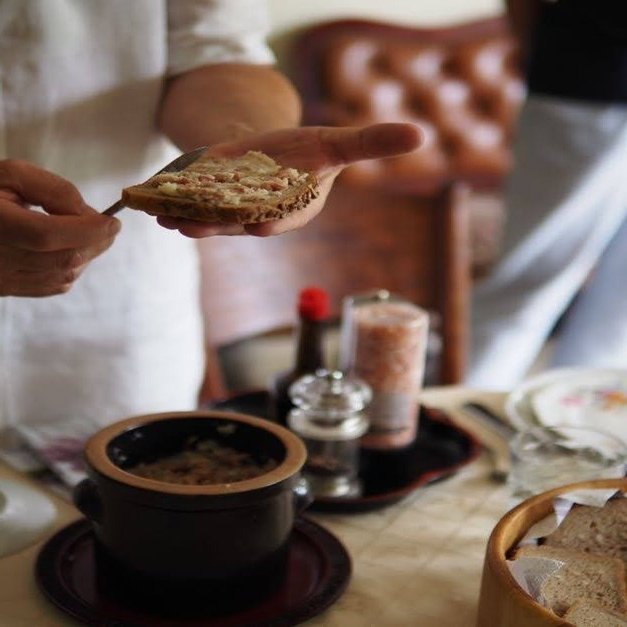 スマレッツ(smalec)も保存食で、ラードにたまねぎやベーコンを混ぜて固めた、悪魔のようにおいしい食べ物。ヴォイチェフさん、これをパンにたっぷり乗せて差し出してくれます。