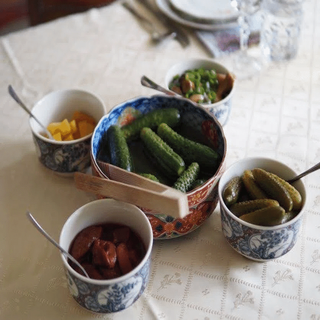 まずは漬物の皿が次々と運ばれてきます。キュウリのピクルスは浅漬け、古漬け、酢漬けの3種類が全て手作り。ピクルスは酢を使わず、きゅうりと塩とハーブだけで、乳酸発酵させて作ります(テーブルには甘酢漬けもありました)。キャベツのザワークラウトも同様です。キノコやかぼちゃの酢漬けは日本では珍しいですが、ポーランドではポピュラーなものだそう。