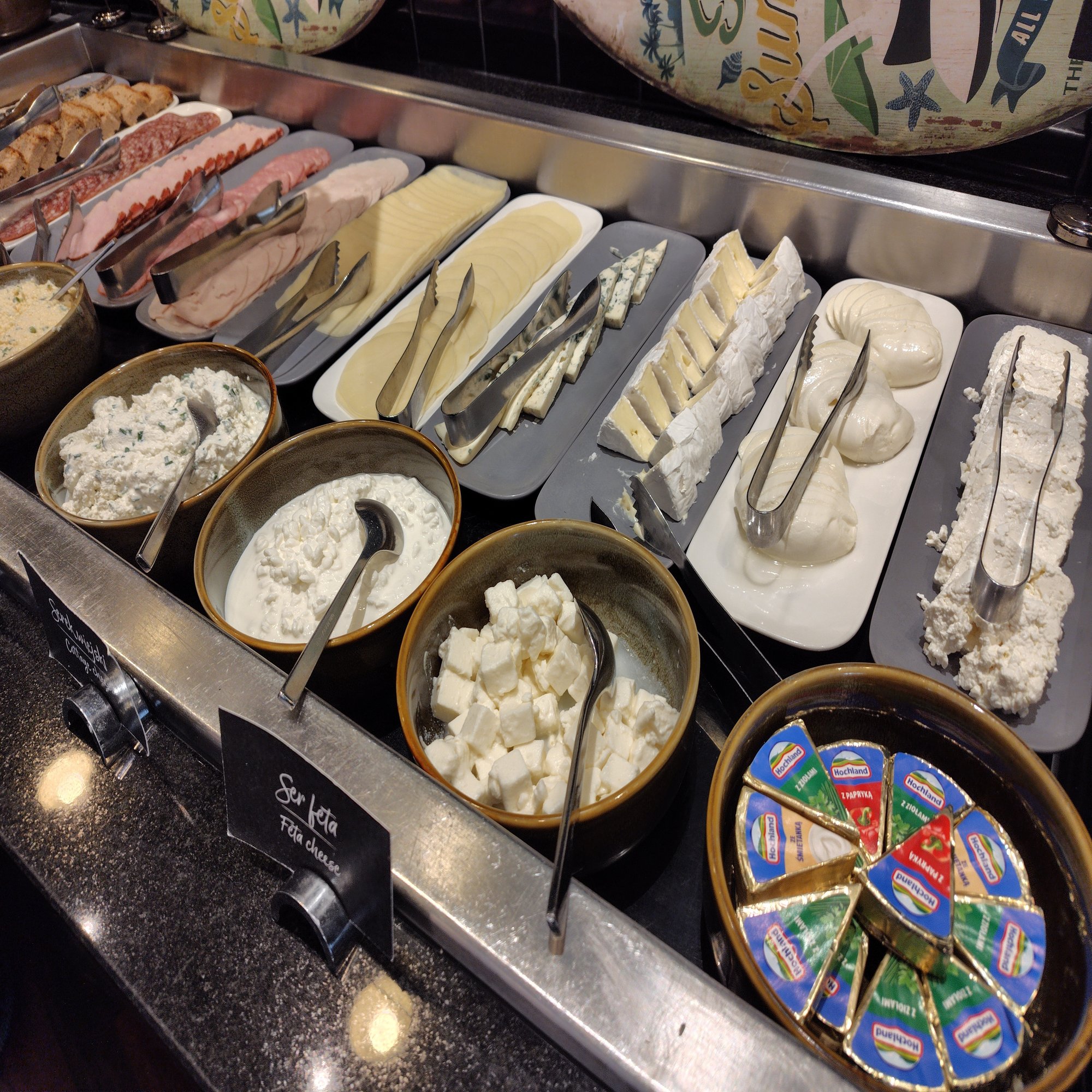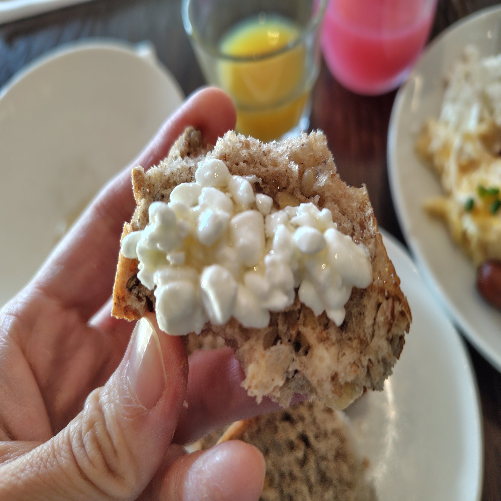 ポーランドのメジャーなチーズでは、トファルク(Twaróg)というあっさりしたカッテージチーズに似たフレッシュなチーズがあります。ビャウィ・セル(biały ser)という白チーズの塊を食べやすくほぐしたり挽いたりして、発酵乳などを加えたものです。市場では写真が撮れなかったのでホテルの朝食で見かけたのを参考までに。