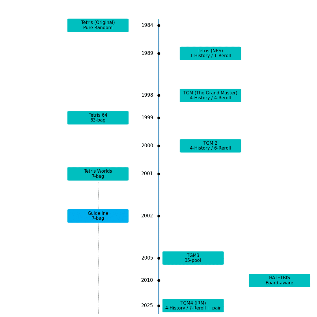 テトリスのランダマイザの進化の歴史を年表にまとめたのが上図である。