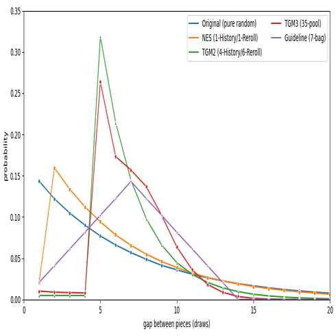 あるテトリミノがでたとき、次に同じテトリミノが出るまでの長さがどうなるかの確率を可視化したのが上のグラフである。間隔1が最大確率でだんだんと減少するオリジナルの分布に比べ、改良版ではどれも「少し間隔をおいてから同じものが来る」性質を持っているのがわかる。また、History/Reroll系はHistoryを見ている範囲4で同じテトリミノが再び出る確率が相当に抑えられているのも確認できる。異彩を放っているのが7-bagで、間隔7を頂点に綺麗な対称形の間隔分布を持っている。TGM3の35-poolの歪んだ分布の形がTGM2より7-bagに近く、ギャップが大きくなった時の確率がかなり抑えられている(干ばつが起きにくく、棒が来る!)のも注目ポイントだ。TGM4の不明アルゴリズムも、こうした頻度分布を描いてみれば正体を明らかにできるかもしれない。