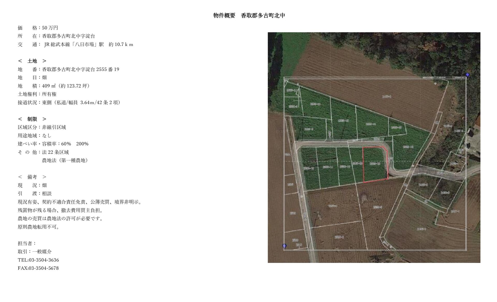 東京の新橋に「マハロ」という、弁護士の相続放棄案件などを専門に扱う不動産会社がある。このマハロで現在、当該の多古町北中の分譲地が売りに出されている。しかし、担当者に電話して話を伺ったところ、やはりこの農地転用の問題が足枷となり、もう2年以上、買い手が決まらないまま停滞しているそうである。ちなみにその売主はA氏と異なり特に多古町役場に抗議の電話などは行っていないので、現在でも年間12000円の固定資産税を支払い続けているという。また売主は特に、その土地を誰かに貸している話をしていたことはないそうだ。もはや無断耕作であることに疑いはない。
