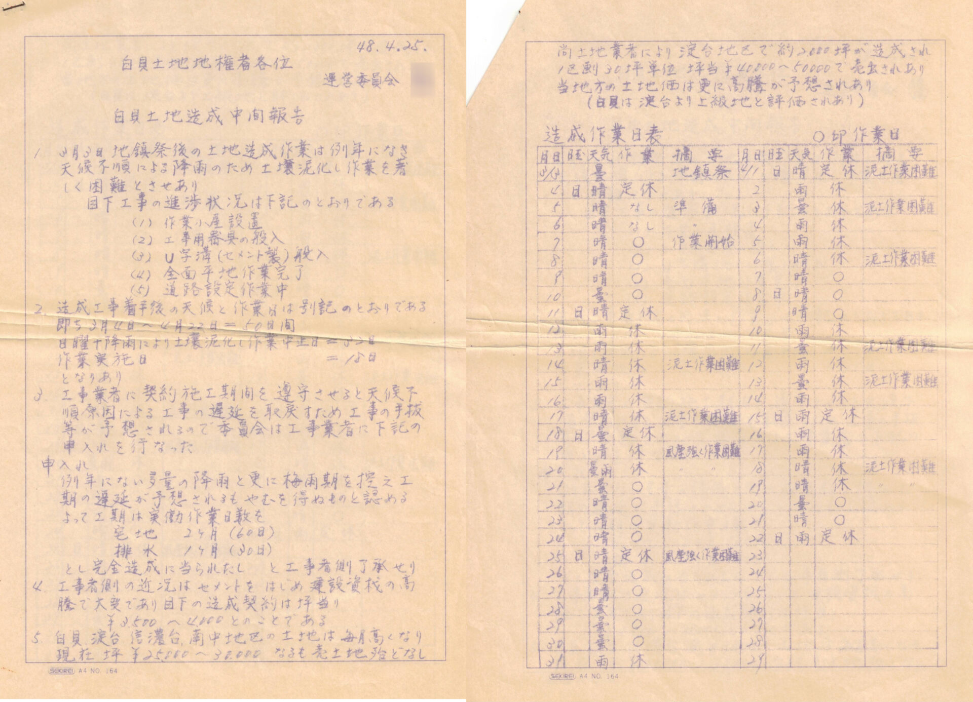 「白貝、淀台、信濃台、南中地区(引用者注;すべて多古町内の地名)の土地は毎月高くなり現在坪¥25,000~30,000なるも売土地殆どなし。尚土地業者による淀台地区で約2,000坪が造成され1区劃30坪単位坪当¥40,000~50,000で売出されあり。当地方の土地価はさらに高騰が予想されあり(白貝は淀台より上級地と評価されあり)」