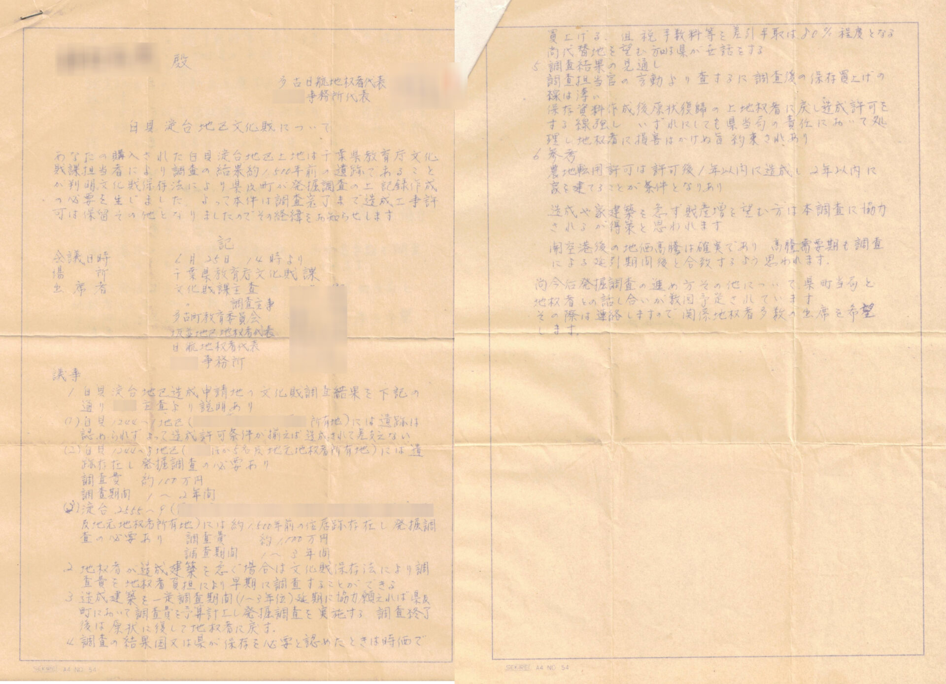 「多古日航地権者代表」者による文化財発掘調査についての通達。農地法5条許可に基づく転用を行う意思がない場合は協力すべしと記載されており、この分譲地が、違反転用を想定の上で分譲されたものであることを示唆している。