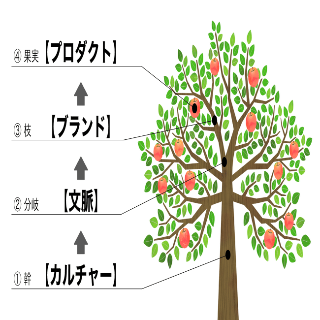 界隈とカルチャーの構造を、樹と森の関係性に捉えた。それを踏襲して、次にカルチャーとブランドとの関係性を図にすると、まさに樹の構造になると思う。