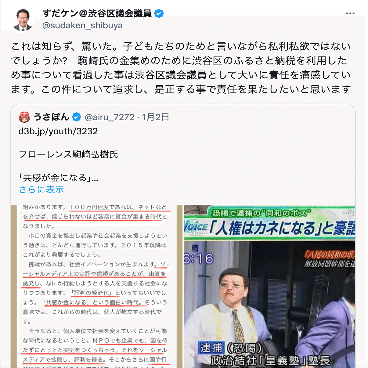 さらに、本件投稿は、私・駒崎弘樹及び本件投稿内容とは全く関係の無い恐喝被疑事件の逮捕報道の画像(『人権はカネになる』等のテロップが入ったもの)を添付した投稿をリポスト(引用)しており、当該画像をしてあたかも私・駒崎が犯罪行為又はこれに類似する行為を行ったと誤認させることを意図した悪質な投稿といわざるを得ません。