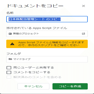 中ほどにApps Scriptファイルと機能もコピーされますうんぬんが表示されますが、これは先述の「STOCKPRICEJP関数」のものですので、気にしなくて大丈夫です。