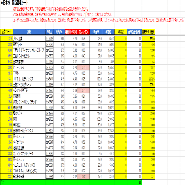 目安株価を入力して算出された理想利回りが、現在の利回りよりも下回るとセルが赤くなります。