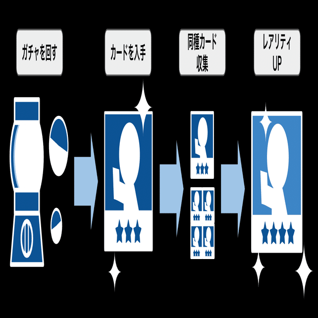 それがガチャ合成育成モデルというものになります。この記事を読むような方なら、ほとんどの方が知っていると思いますが、このモデルをざっくり説明すると、ガチャでキャラクターのカードを引いて、それをどんどん合成してキャラクターを育成するモデルのことになります。