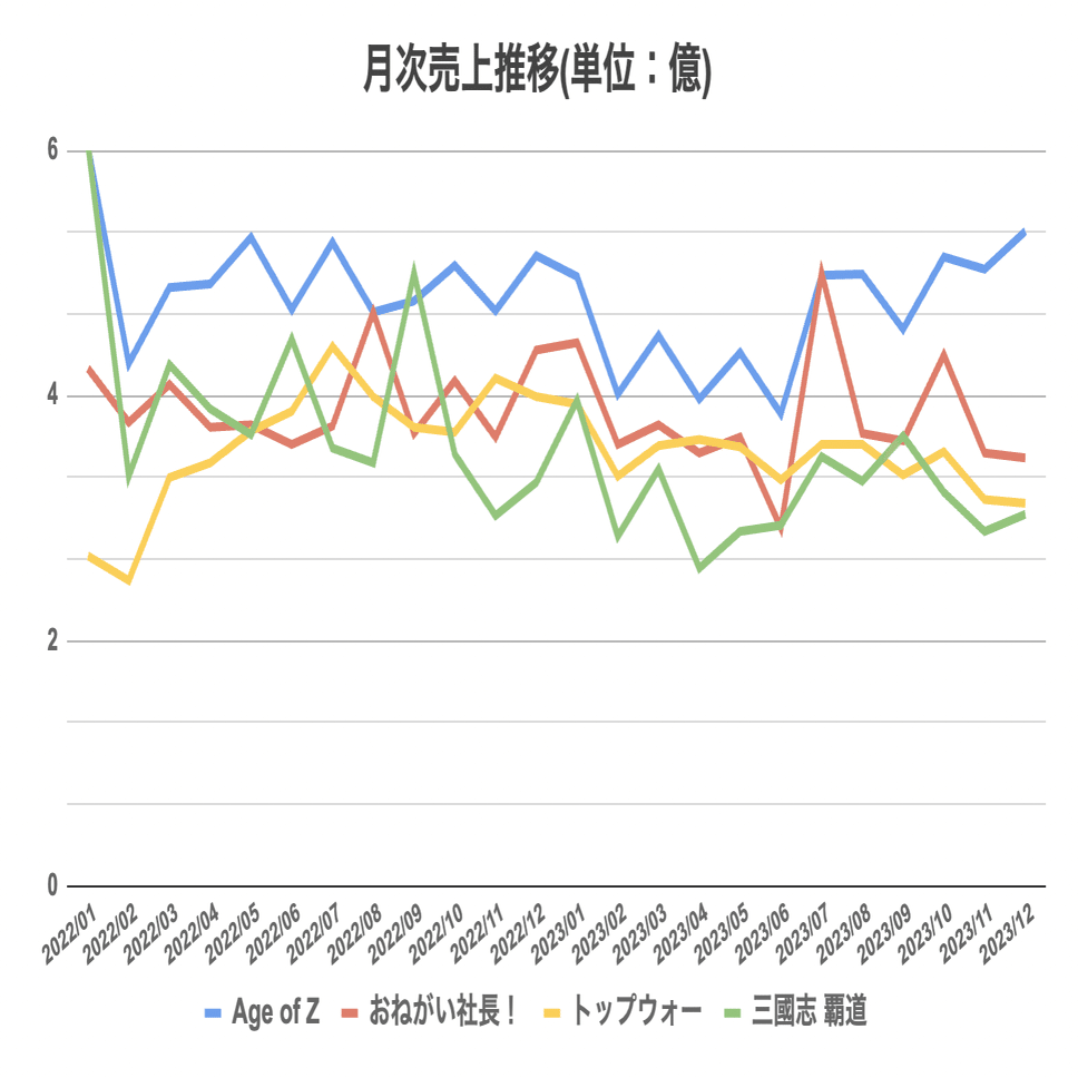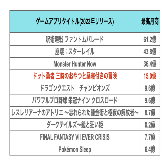 例えば、2023年にリリースされたタイトルのうち、最高月商順に並べた上位10位までのタイトルがこちらなのですが、