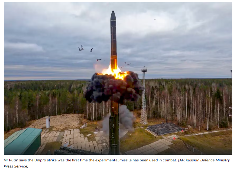 米軍が予想した通りにロシア当局は激怒し、報復としてウクライナのドニプロ市に核弾頭を装備できる中距離弾道ミサイルを叩き込んだ。当初ウクライナ側はICBM(大陸間弾道ミサイル)に攻撃されたと発表したため、久々にこの戦争のネタで世界中の金融市場が震撼されたが、恐らくこれが最後の震撼になるだろう。ロシアは使用したミサイルを新型の極超音速ミサイル「オレシュニク」と発表したが、このミサイルは要するに米ソ間のINF(中距離核戦力全廃条約)が2019年に破棄される前からロシアが開発し、最大射程が辛うじてICBMの定義(5,500km以上)に届くためICBMと言い張っていた、いわば脱法IRBM(中距離弾道ミサイル)の改良版にすぎない。INFが締結されたきっかけは1970年代後半にソ連が「米国には届かないが欧州には届く」SS-20中距離弾道ミサイルをウラル山脈以西に配備して米国と欧州の分断を狙ったことであるが、ウクライナでの脱法IRBMの実戦投入をプーチン政権が高らかに宣言したことで、歴史は繰り返されることになる。プーチンは更にオレシュニクでキエフを攻撃できると恫喝した。