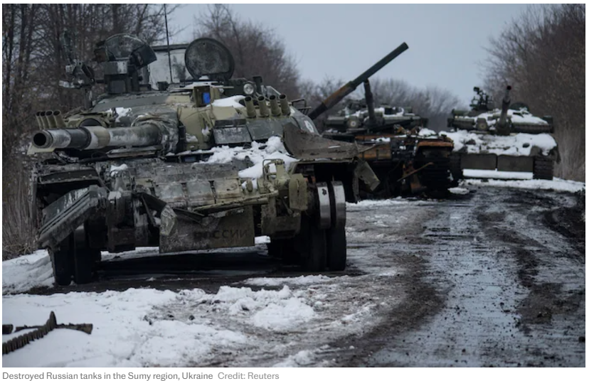 占領地が縮小するにつれて戦後の停戦交渉におけるカードとしての価値も低下するため、どこかでウクライナ軍は作戦を切り上げて部隊をスムイまで撤収させるのが合理的である。あまりにも長引かせると総予備隊が溶けてしまうというのが常識的な見方だ。しかし大統領府と総司令部の頑固さは再び我々を驚かせた。ウクライナ軍は占領地の死守を決め込み、隙あらばごく局地的にとはいえ反撃にさえ出た。随伴歩兵も不足してきたのか、第21機械化旅団の残り少なくなった孤独なレオパルド2がロシア軍陣地に向かって突撃していく姿も見られた。待ち構えていたロシア軍のドローン群が当たり前のように襲い掛かり、たちまちレオパルド2は火だるまになってしまう。それでもウクライナ軍はめげずに様々な国籍の主力戦車を前面に繰り出し続けた。泥濘期の悪天候が終わってみるとこれまで車両を空から隠してくれた防風林の葉はすっかり禿げてしまっており、薄い雪が積もり始めた戦場は一段と隠れ場所がない平野に近付く。