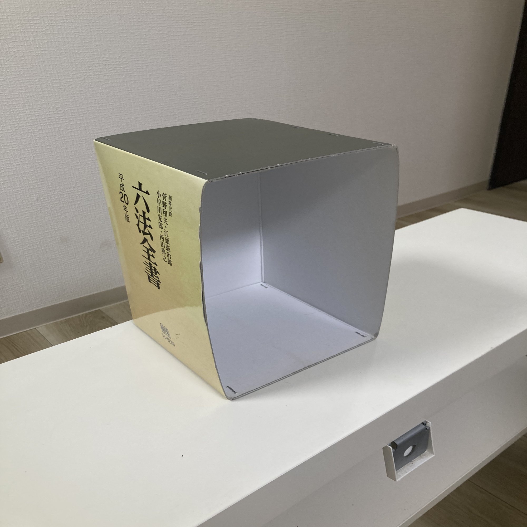 ここで、司会が暗幕を剥ぎ取り、中から六法全書のケースが出てきました。