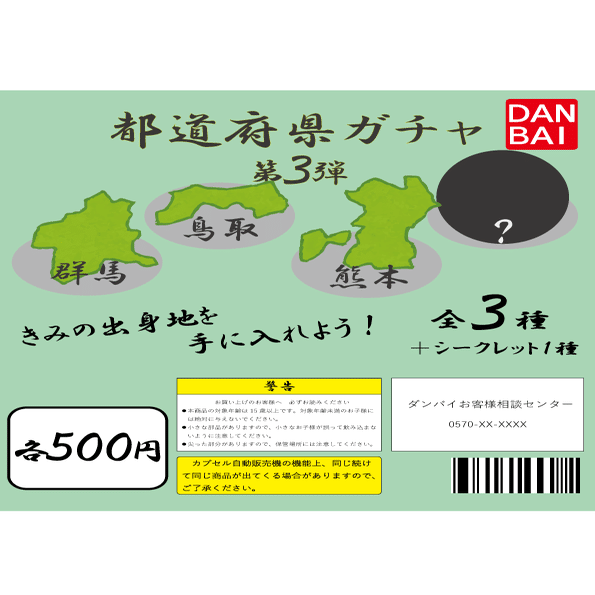 「都道府県ガチャ第3弾」は、群馬・鳥取・熊本・シークレット、というラインナップです。