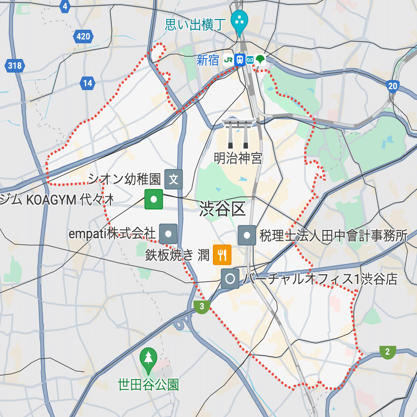 色分け地図を作るためには、区域ごとの統計データ(たとえば「神奈川県横浜市は200」など)とあわせて、区域の境界線を示すデータが必要です。Google マップやTableauなど、各種のウェブサービスやBIツールにおいては、ツール側で区域データを持っている場合があります。たとえばGoogle マップで「東京都渋谷区」と検索すると、渋谷区の区域(境界線)がハイライトされます。