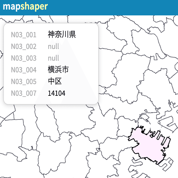 dissolve where='N03_004 == "横浜市"' copy-fields=N03_001,N03_002,N03_003,N03_004 calc='N03_005 = null; N03_007 = "14100"'同じdissolveコマンドですが先ほどと少し条件が異なります。まず「where」の部分で「N03_004の値が横浜市である市区町村」に区切っています。これは後で横浜市の市区町村コードを入れるためです。copy-fieldsとは「結合前後で変化させない項目」です。たとえば都道府県名(N03_001)は結合前後で変わらないのでここで指定しています。calcとは「結合後の値を個別に指定する項目」です。行政区名(N03_005)は「横浜市」になってしまえば該当がないのでnull(ざっくり言うと「値が存在しない」という意味です)、市区町村コード(N03_007)は横浜市のコードである「14100」としています。