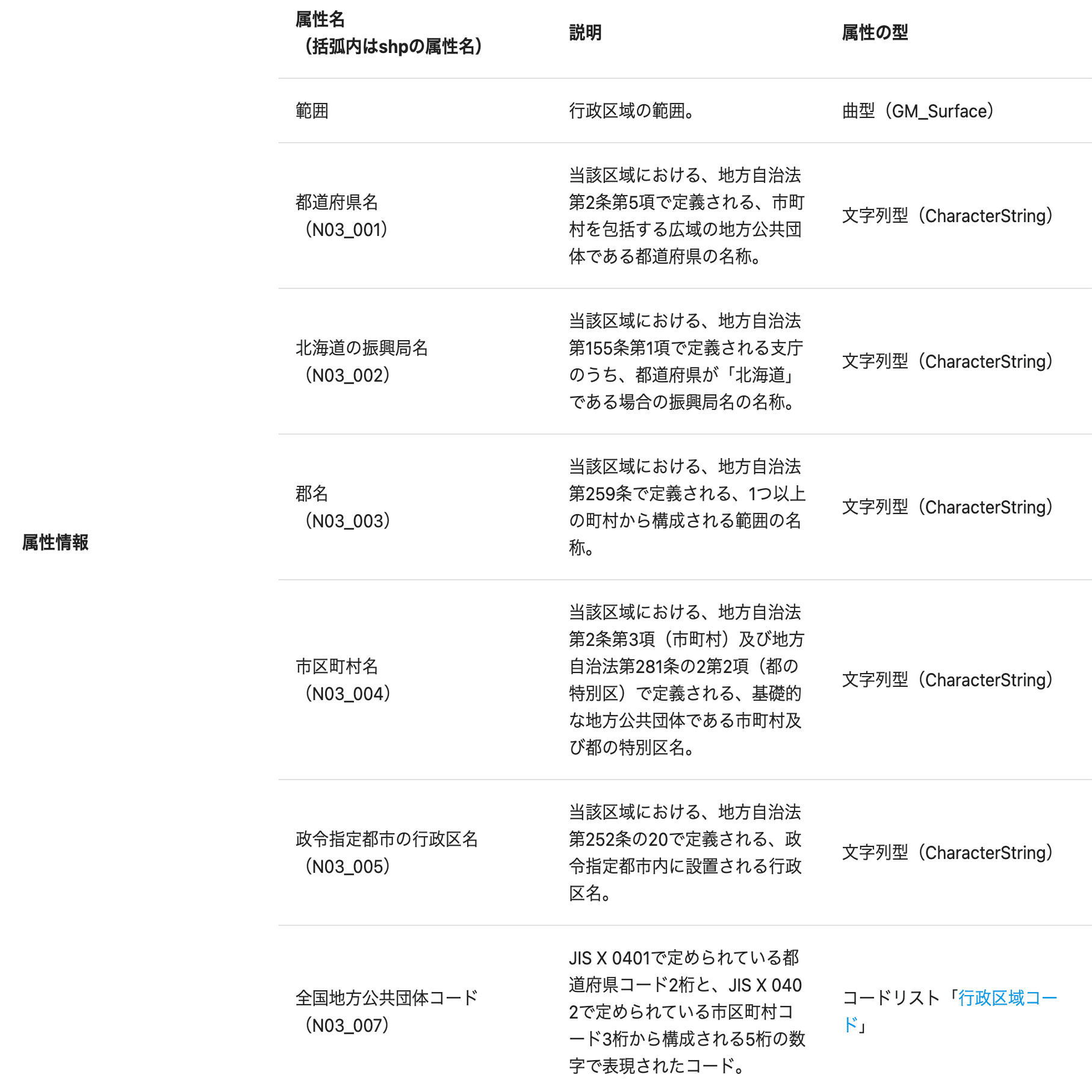 ここに表示される項目名と値の意味は、先ほどデータをダウンロードした国土数値情報のページに解説されています。