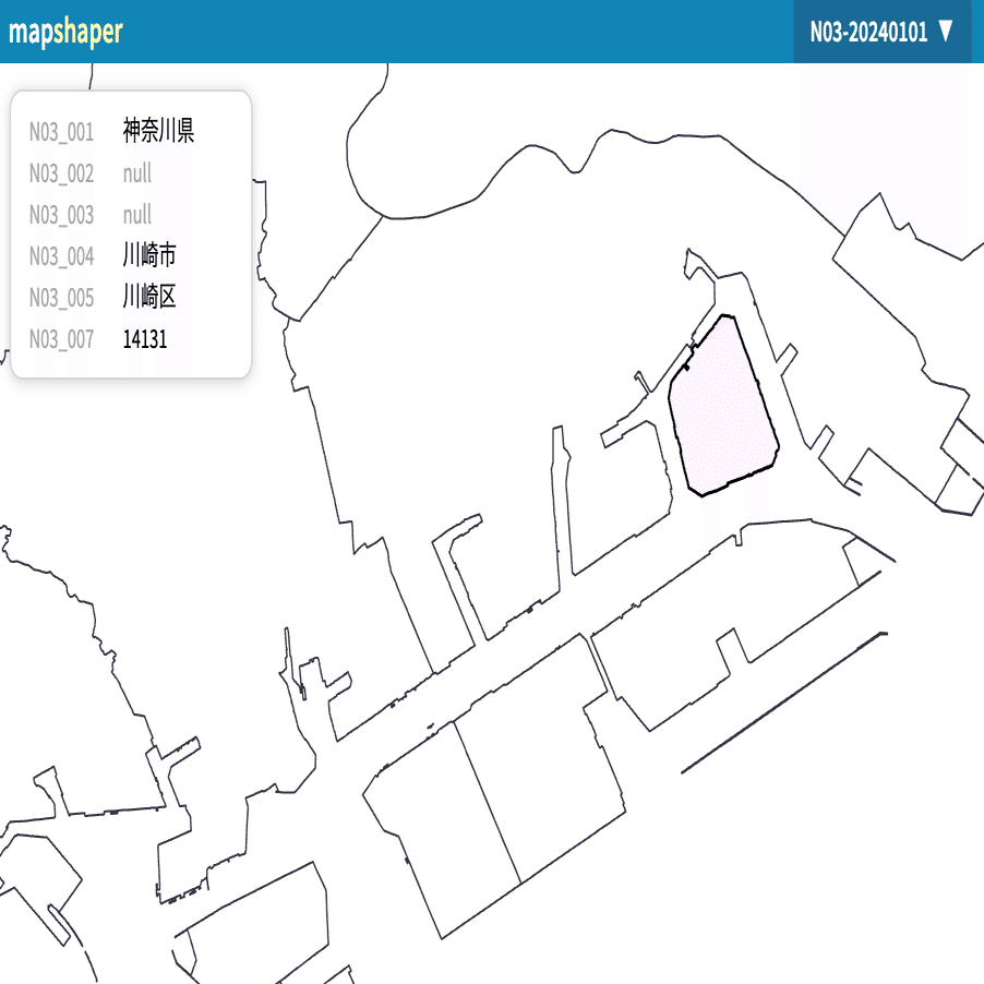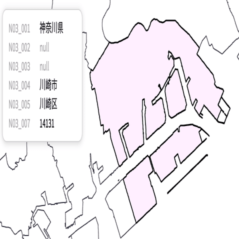 ここからデータの加工に入ります。最初に飛び地や、複数の島にまたがって市区町村が存在するケースの調整を行います。たとえば神奈川県川崎市川崎区は複数の島を含んでいますが、マウスホバーすると個々の島だけがハイライトされます。