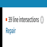 続いてデータのクリーニングを行います。左上に表示されているメッセージ「Check line intersections」を表示します。Simplifyなどの際に隣同士の区域で境界線が若干ずれた際に表示されるものです。「XX line intersections」という表示に変わるので、「Repair」をクリックすると自動で修復が行われます(たまにすべて修復できない場合がありますが、その際は再度Repairを押すかConsoleで「clean」コマンドを実行すると直ります)。