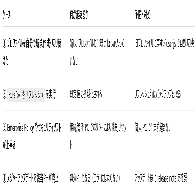 ここでは GUI の設定画面にない細かなパラメータまで変更できます。操作を誤るとブラウザが起動しなくなるリスクもゼロではないため、以下の 3 点だけ先に対策 を行いましょう。