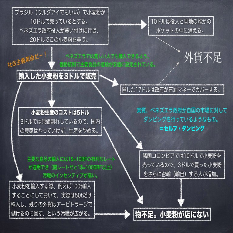 これ、経済学でやっては行けないことの全てをやってます。タイムリーなので、授業でも取り扱いたい図ですね。これ、今用意したものじゃなくて、2016年に破綻が明るみになった時に出回っていたものを保存していたものです。もう一度使うとは思っていませんでした。ポピュリズムの成れの果てですね。チャベス政権が当時はここまで酷いと思ってなかったので反省しています。